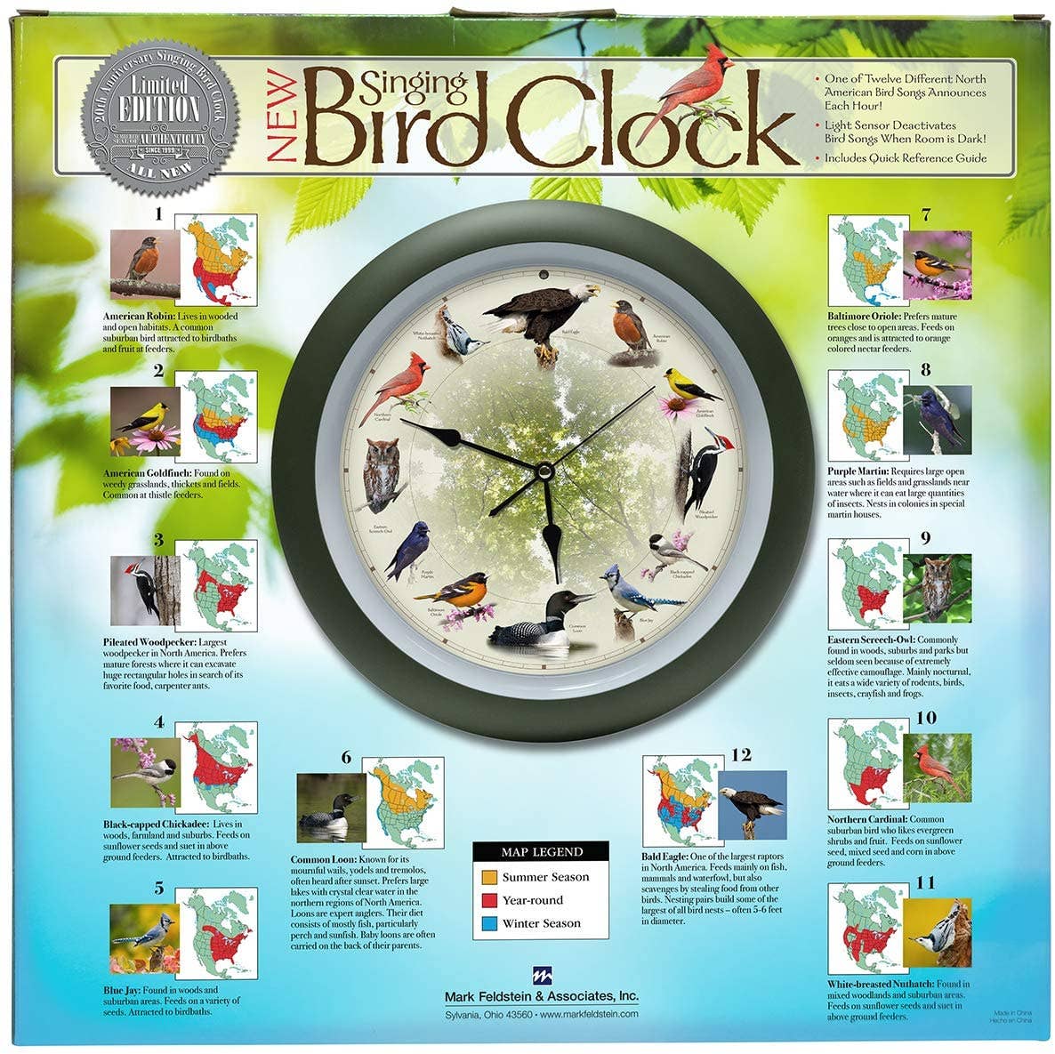 Framed in Green Matte, this clock features images and high-end authentic bird recordings. Detailed packaging provides bird habits and habitat information. Light sensor deactivates songs when room is dark.