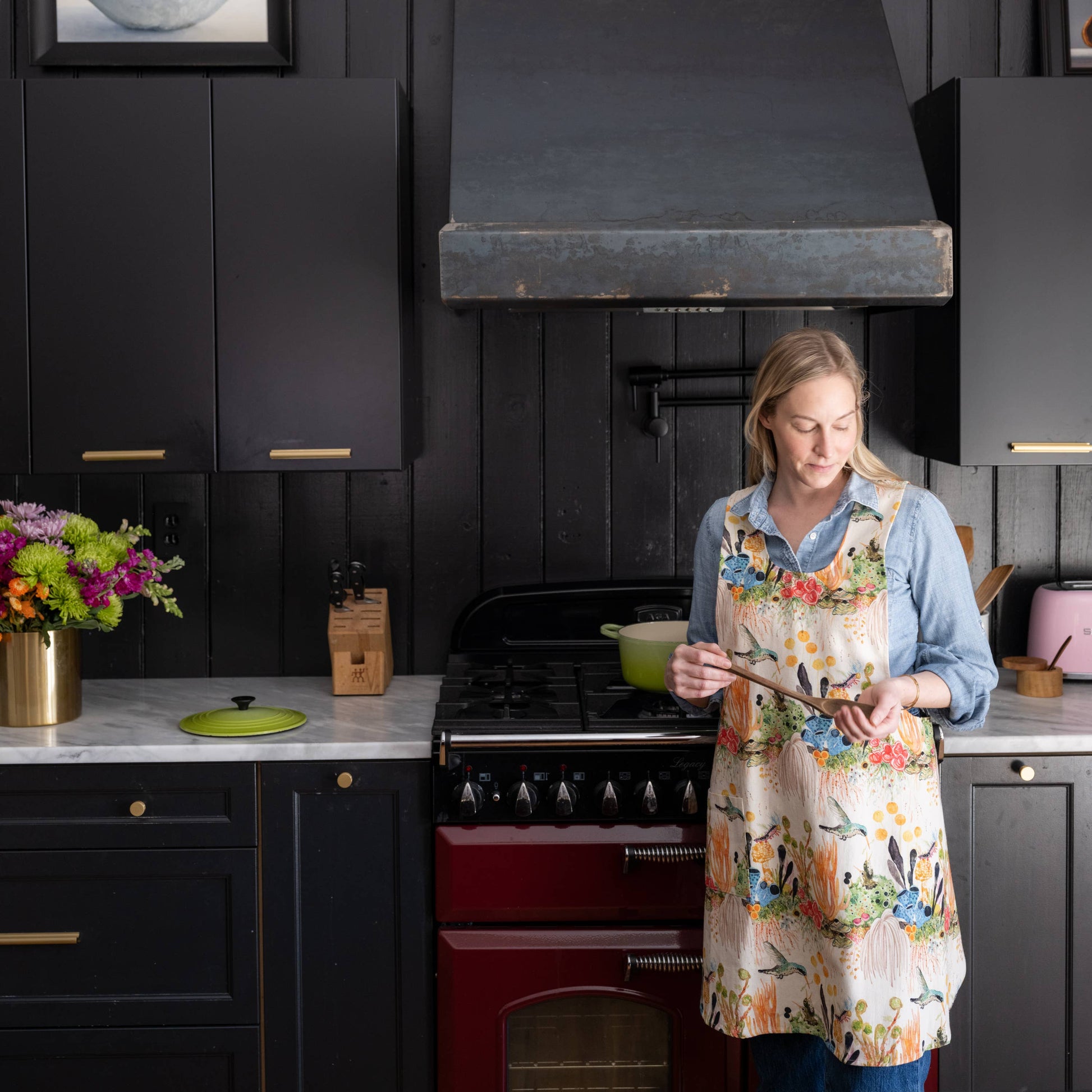 Inspired by the vintage 70’s smock, these cross back, pullover aprons are one of our bestsellers and a customer favorite. Perfect in both the kitchen and garden, the full coverage and side pocket provide comfortable protection from cooking and planting alike. Colorful and conversational, they feature Betsy’s original watercolor designs.