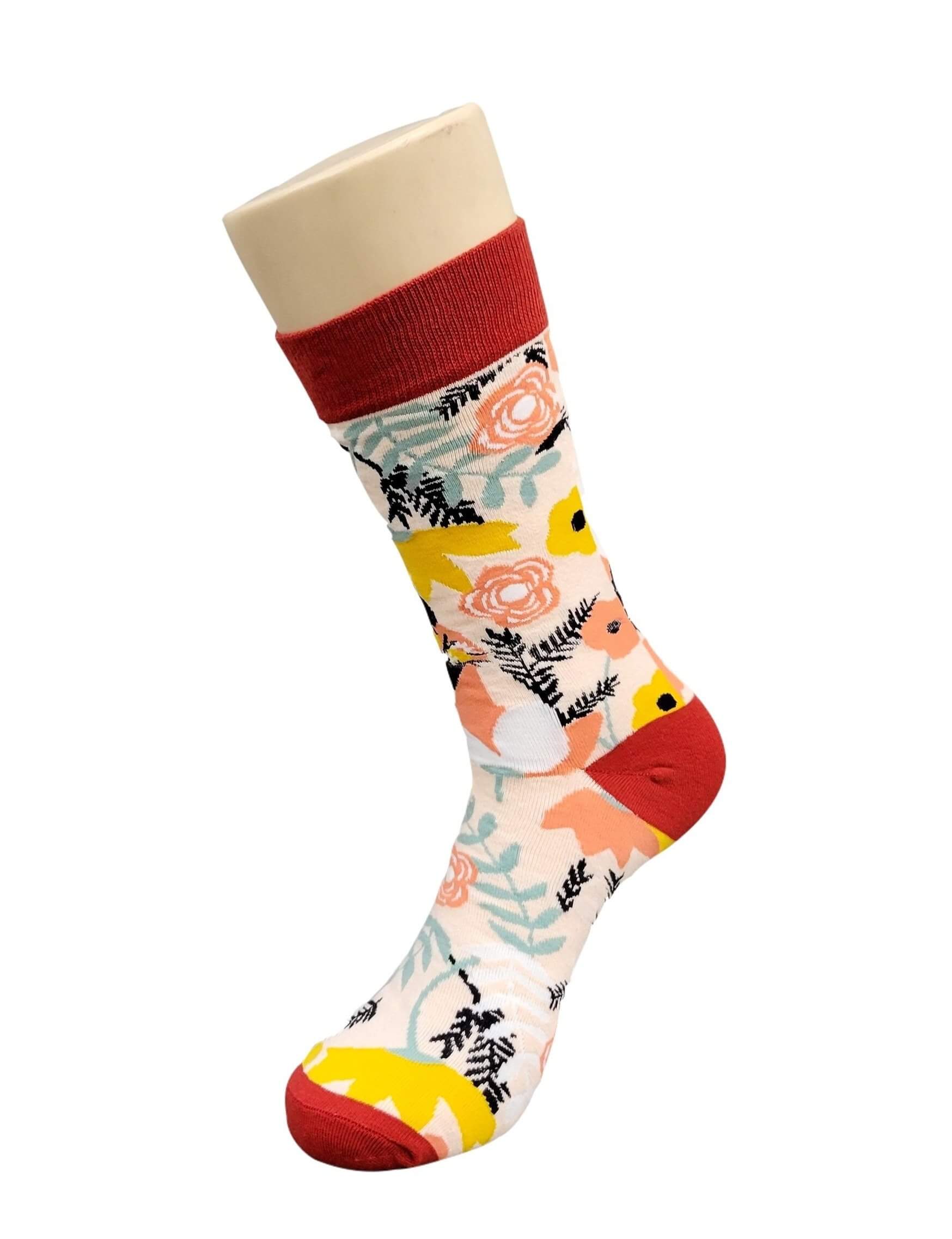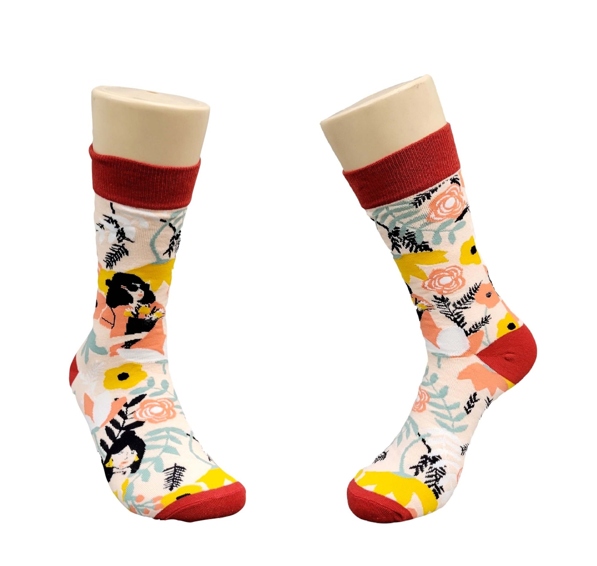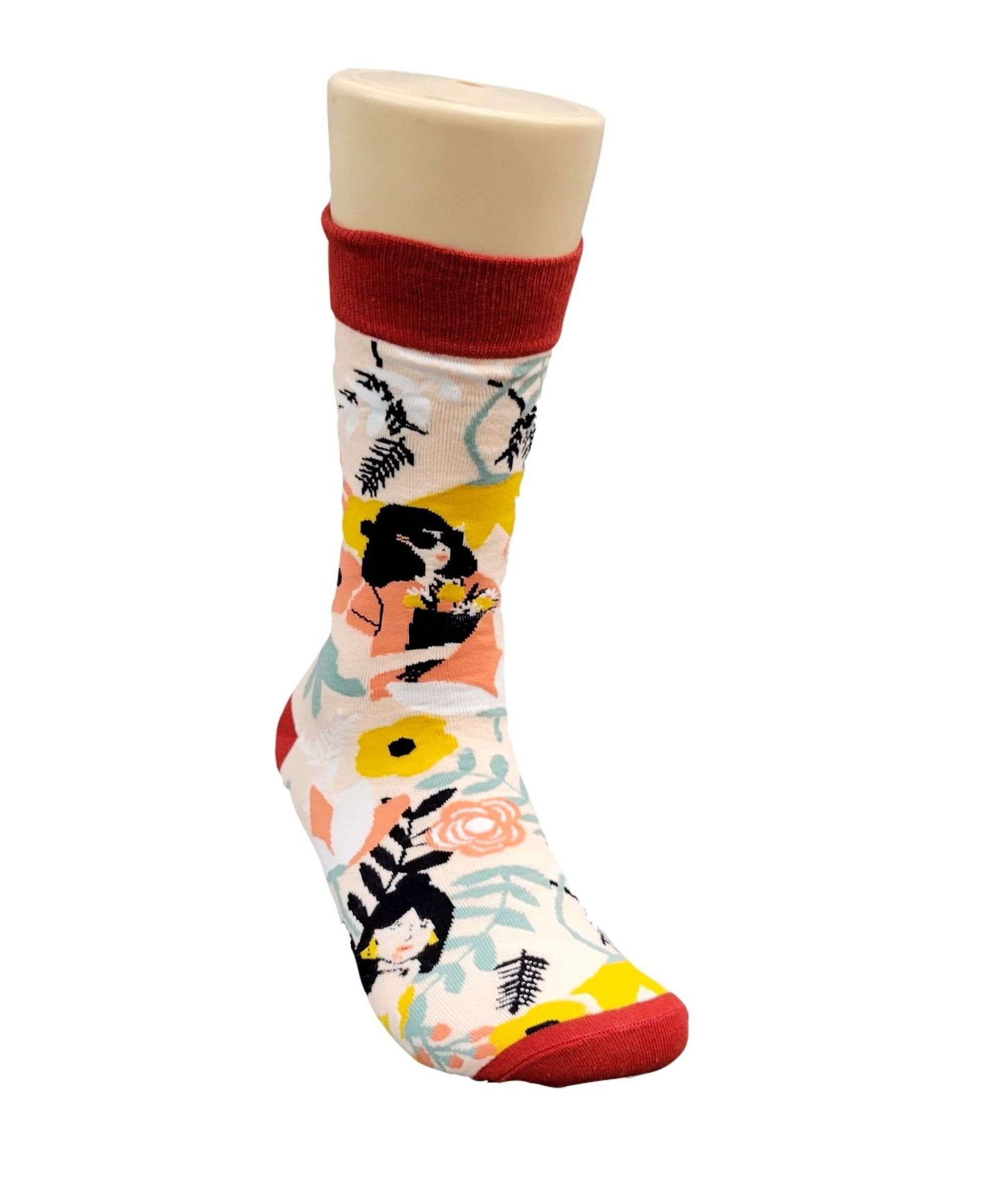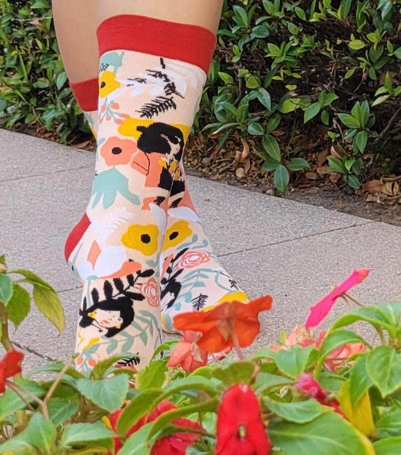 There's something old school and a little tropical about this lady with plants. Fun and artistic, attention-getting design. Up your sock game with these fun socks!
