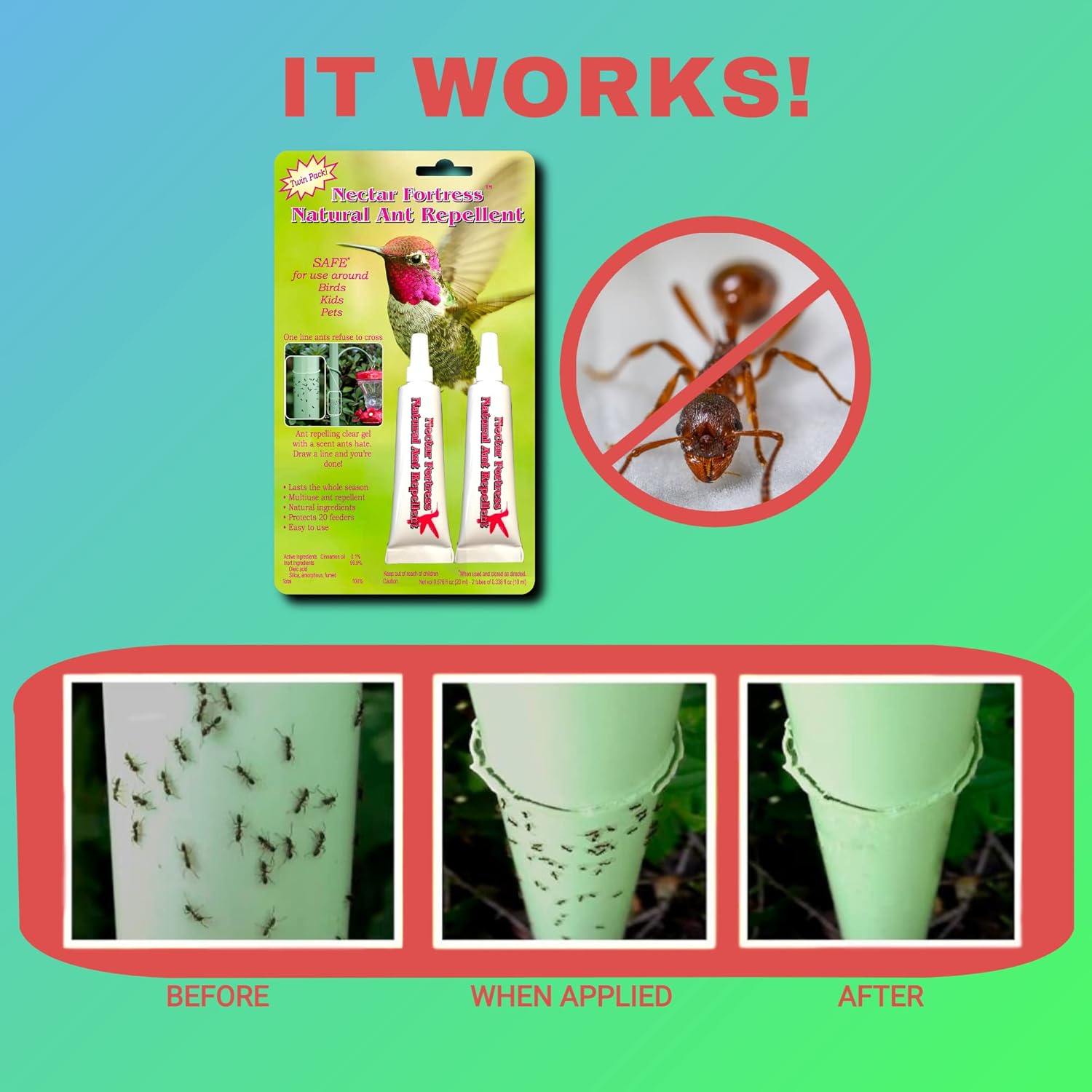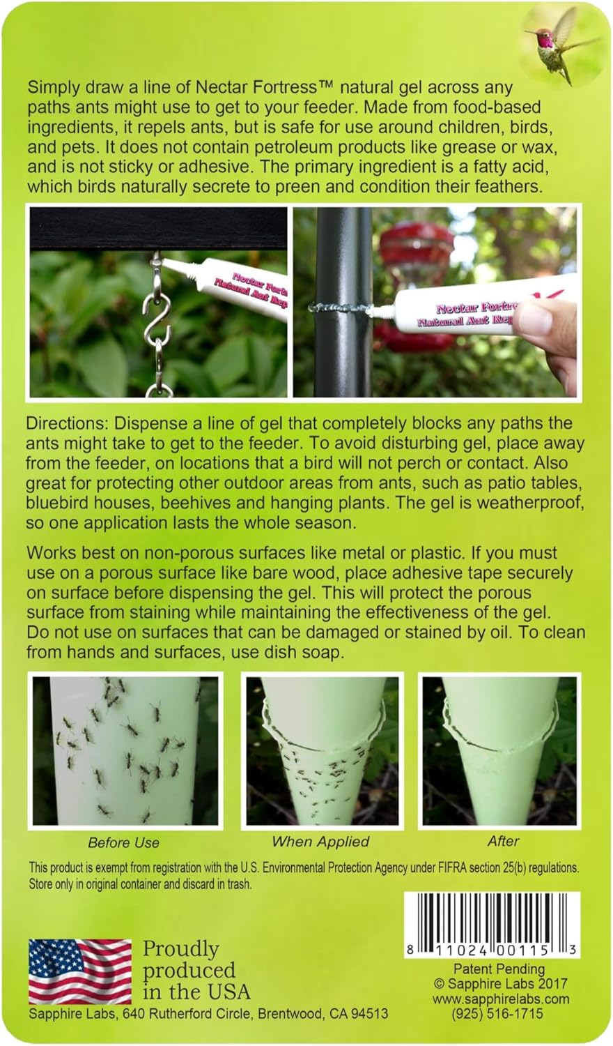 Simply draw a line of Nectar Fortress™ natural gel across any paths ants might use to get to your hummingbird feeder to stop them in their tracks. Made entirely from food-based ingredients, it repels ants, but is safe* for use around children, birds, and pets. It is weather-resistant and long-lasting. One tube contains enough gel to protect up to 10 feeders. Nectar Fortress is also great for protecting many other outdoor areas from ants, such as patio tables, bluebird houses, beehives, and hanging plants.