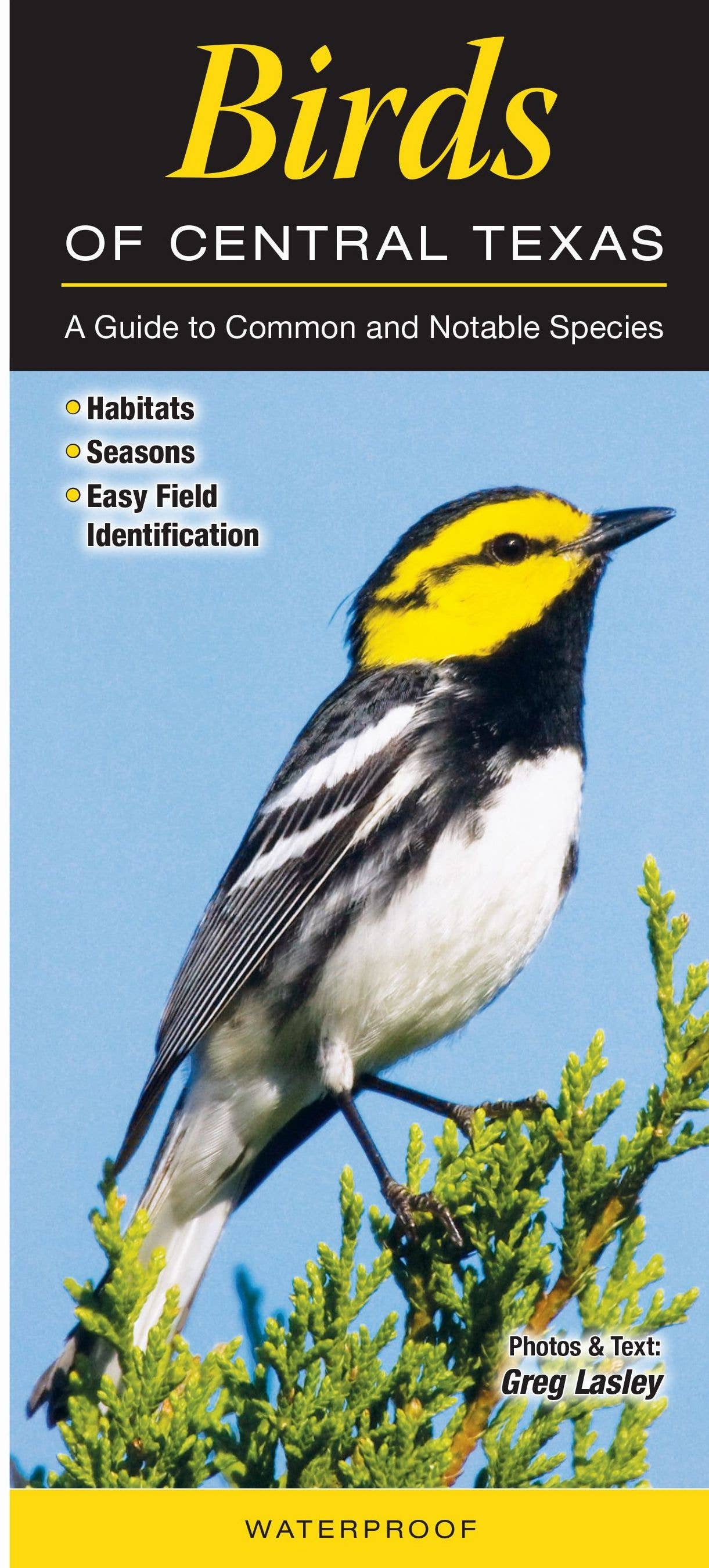 Birds of Central Texas is a 12-panel, folding, laminated, waterproof guide to the common and notable birds species of central Texas, roughly defined as the area between Waco and San Antonio as well as extending well into the Texas Hill Country to the west and into the Blackland Prairie Country to the east toward Houston.