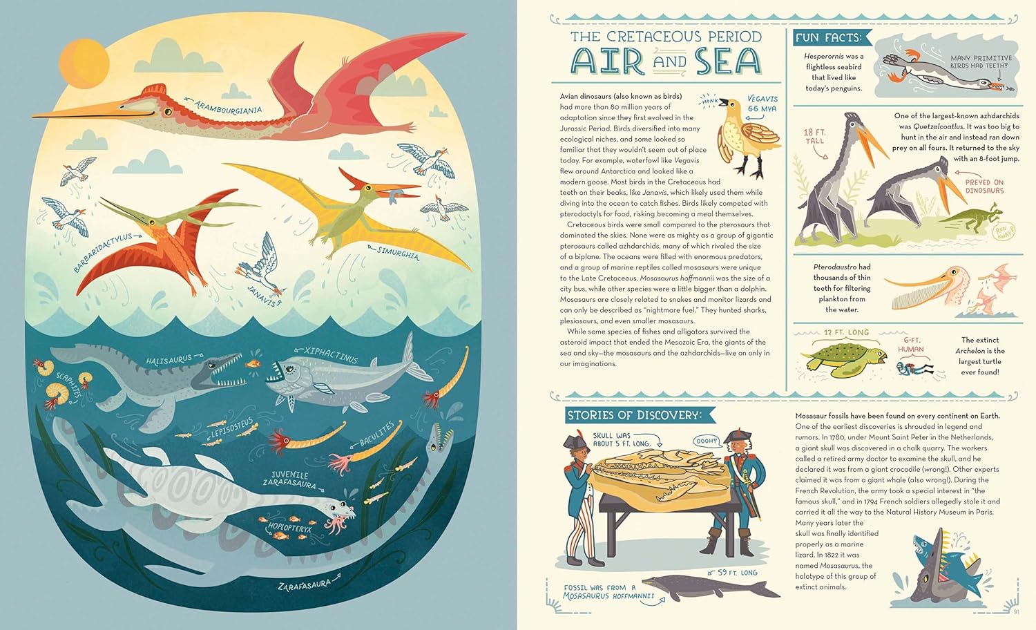 With an exciting blend of vivid artwork and astonishing scientific facts, Dinosaurs journeys through Earth’s inhospitable origins, when the only life-forms were single-celled organisms—to the beginnings of life as we know it during the Paleozoic Era: plants covering whole continents with forests, winged insects taking to the sky, and seafaring vertebrates evolving to survive on land. Traveling forward in time, you’ll explore the Mesozoic Era, when dinosaurs like the gargantuan Tyrannosaurus rex, the long-necked Brontosaurus, and the lumbering Stegosaurus walked the Earth. Then you’ll venture into the Cenozoic Era’s ice age, where you’ll meet mammals like the Woolly Mammoth and early humans.