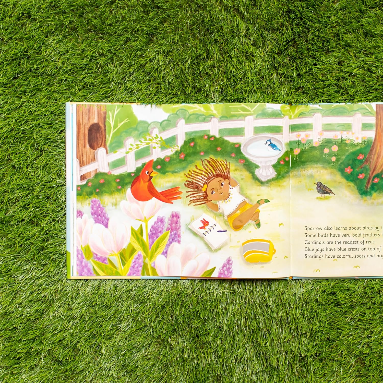 Sparrow sets out for a day of birding, where she watches, listens, and identifies the many types of birds around her through their color (red—a cardinal), song (“Cheer up! Cheer up!”—a robin), and movement (flitting backward, forward, and even upside down—a hummingbird). Using her notebook and markers, Sparrow records all the birds she sees on her walk.