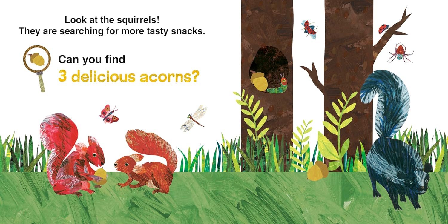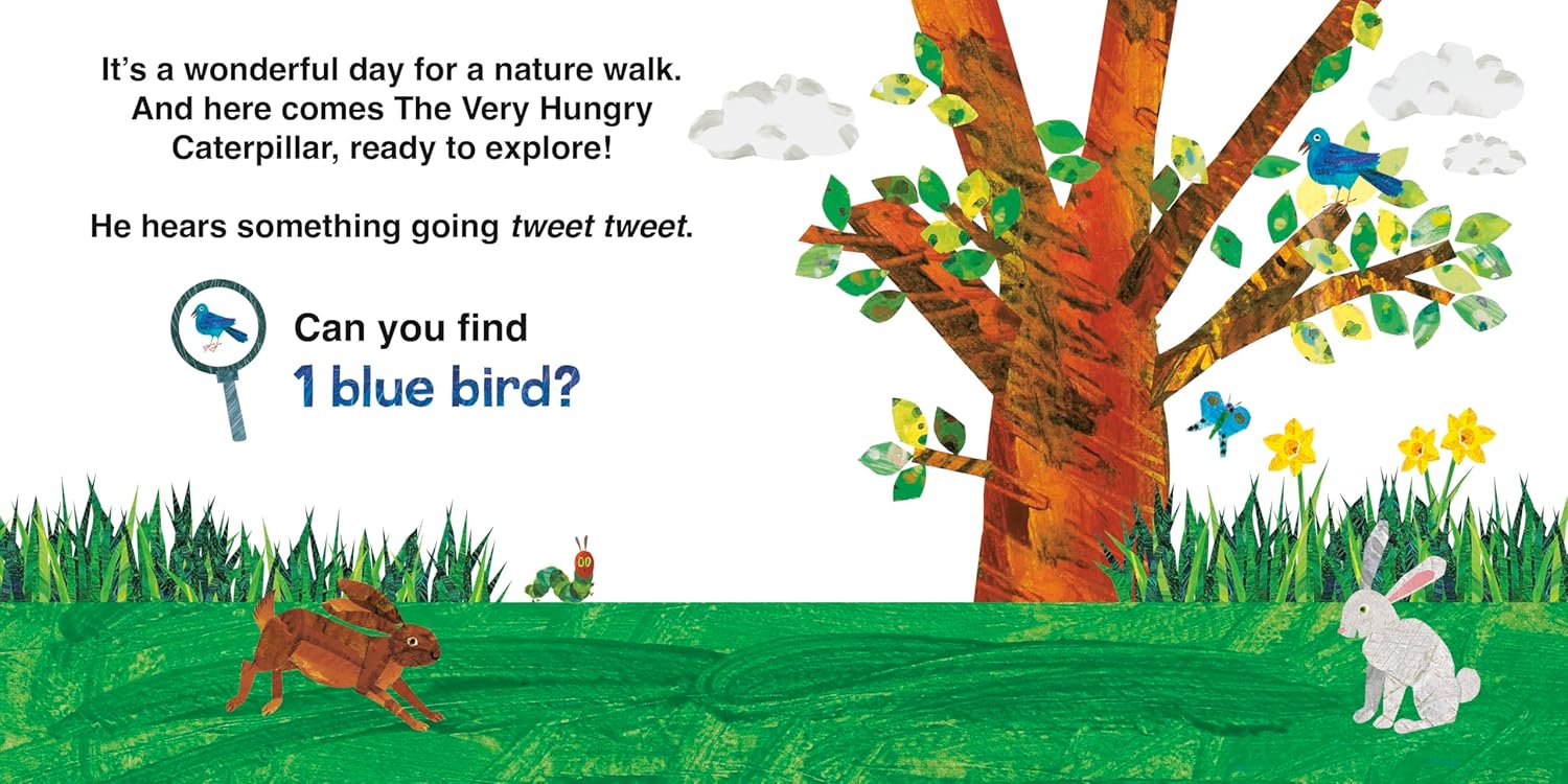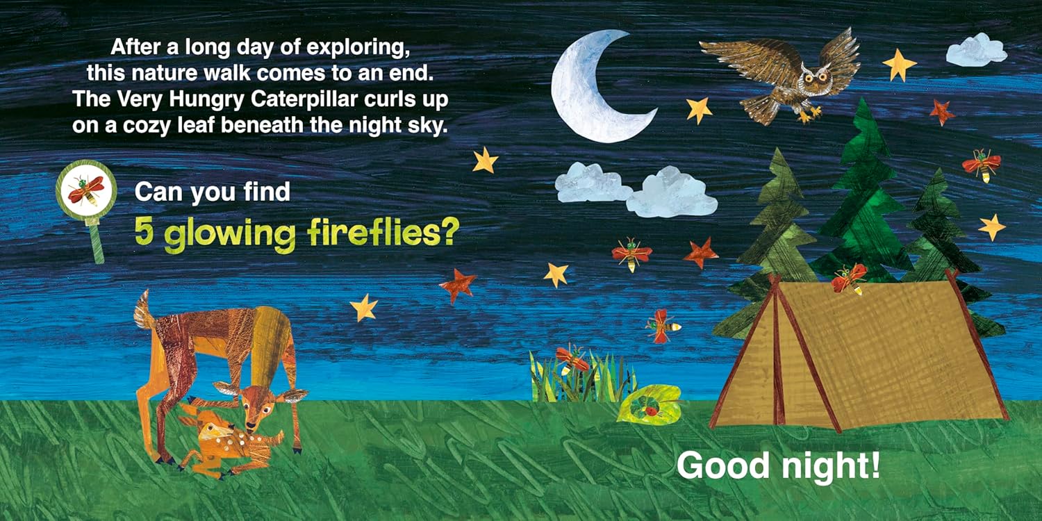 In this engaging search-and-find board book, young readers will be challenged to find various animals on a nature walk with The Very Hungry Caterpillar. Count the creatures hidden on each spread and discover all there is to see in nature. Lace up those hiking boots, grab some binoculars, and get ready for an adventure!