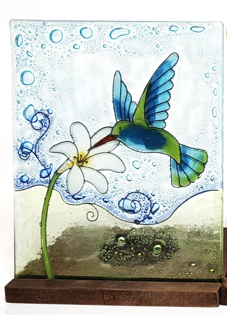 Tea Light Holder - Glass Art - Hummingbird on Blue Background