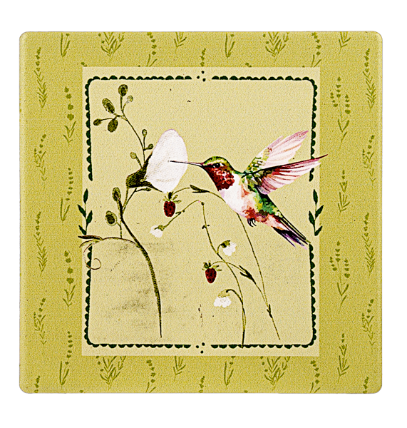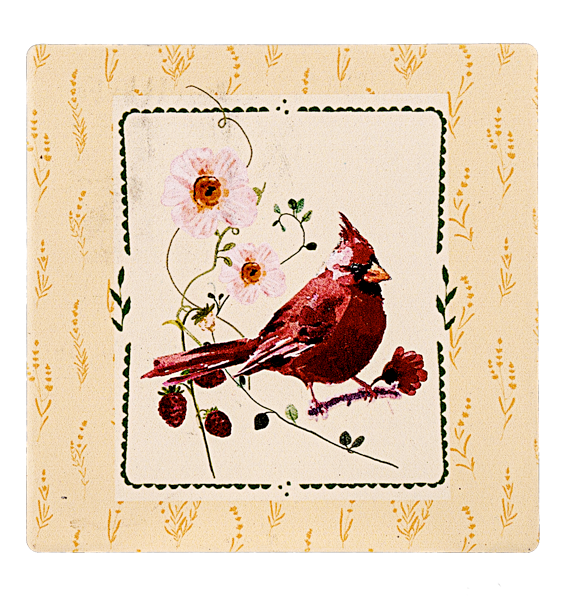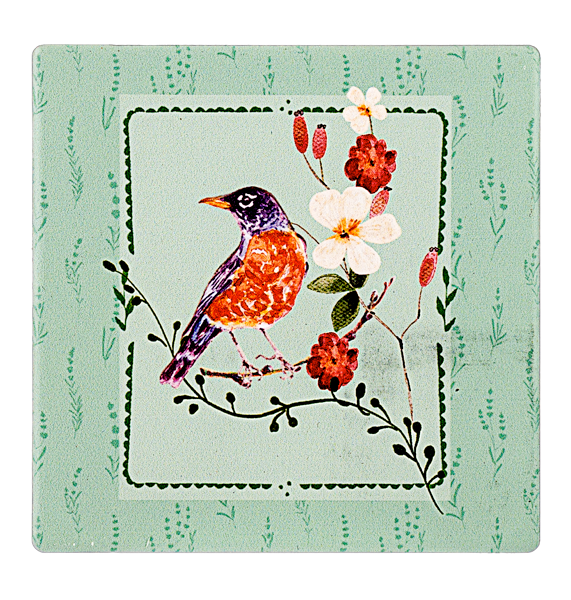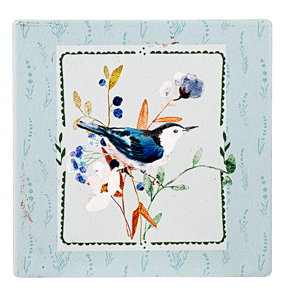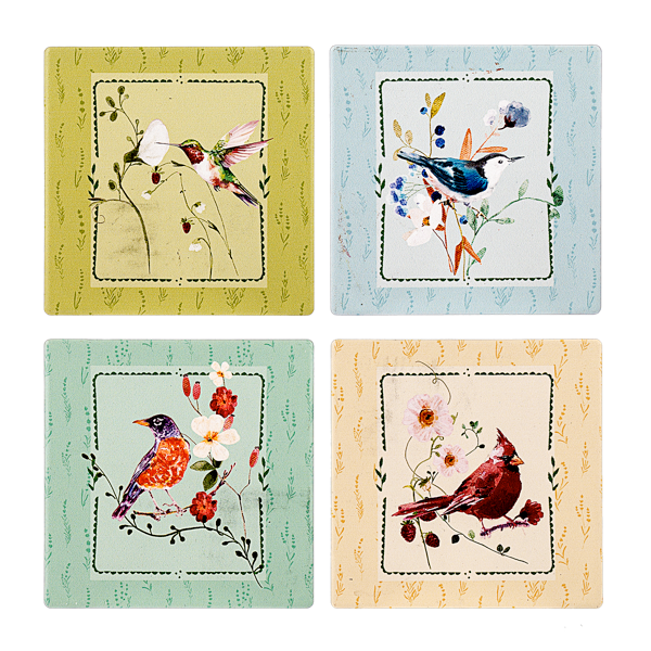 Set of four ceramic coasters backed with cork. Each measures 4" x 4". Birds include robin, hummingbird, nuthatch, and cardinal.