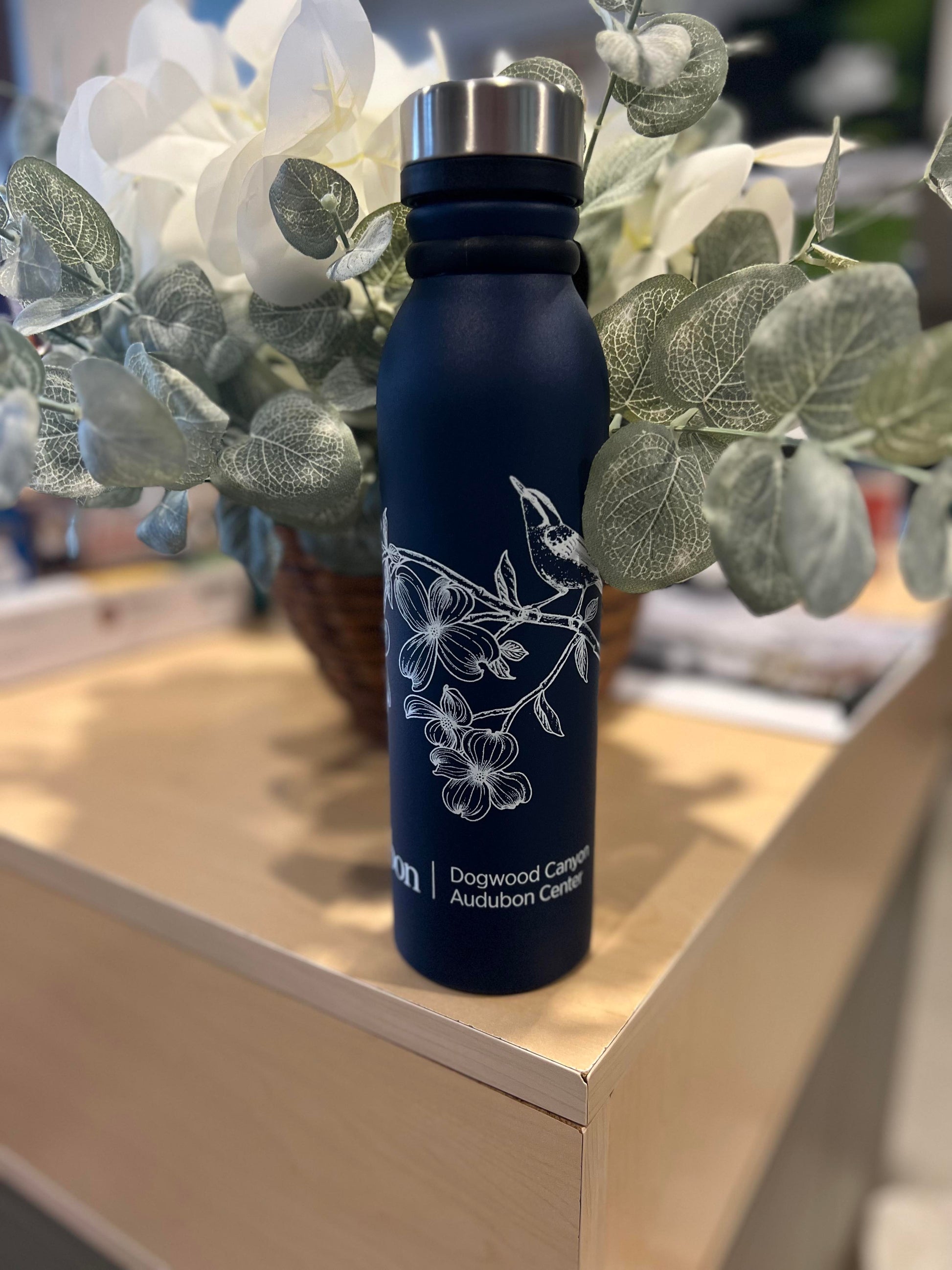 Show your support of Dogwood Canyon with this 23 oz stainless steel water bottle. Design with dogwood flowers, bird, and Dogwood Canyon Audubon Center logo.