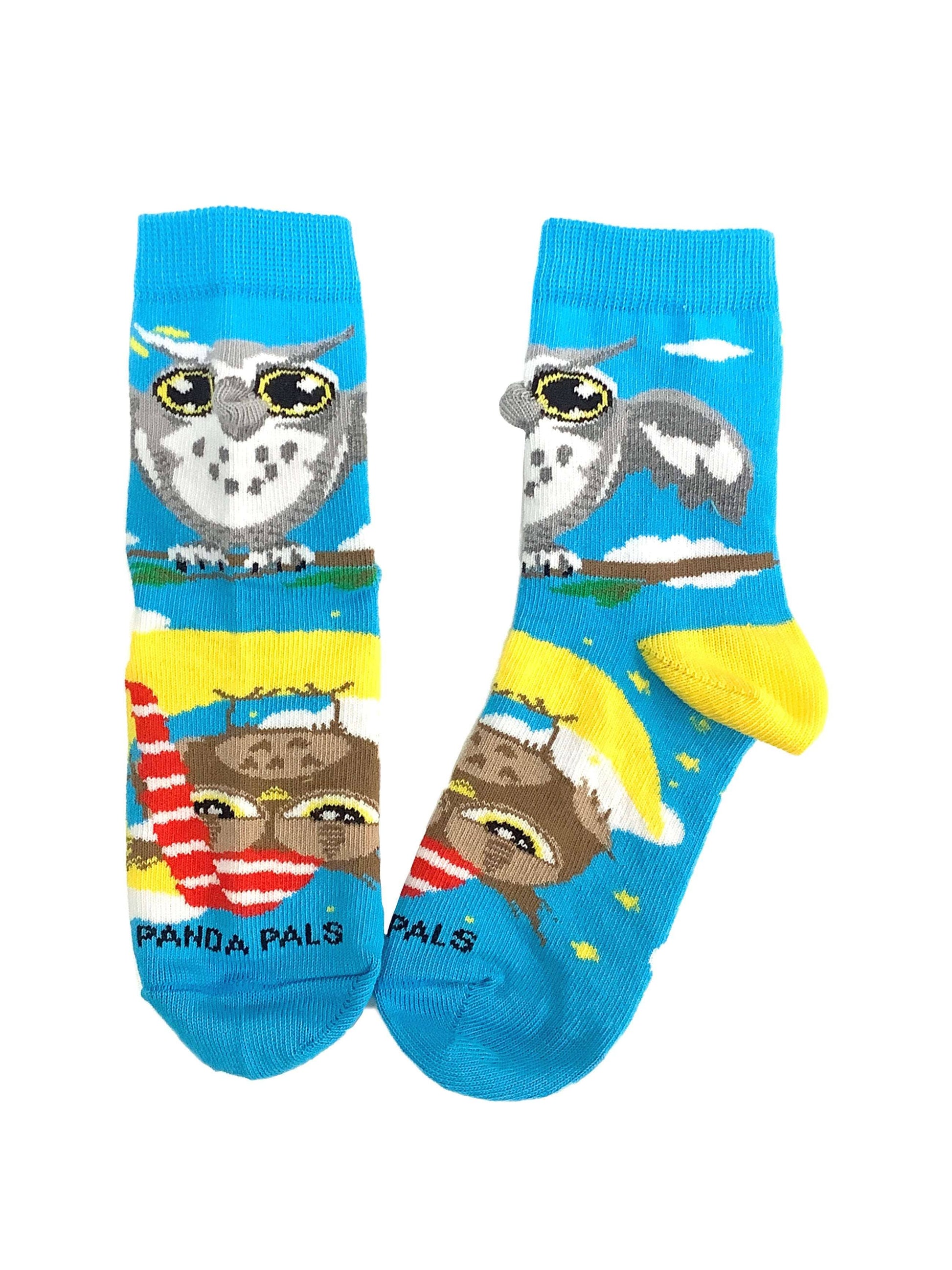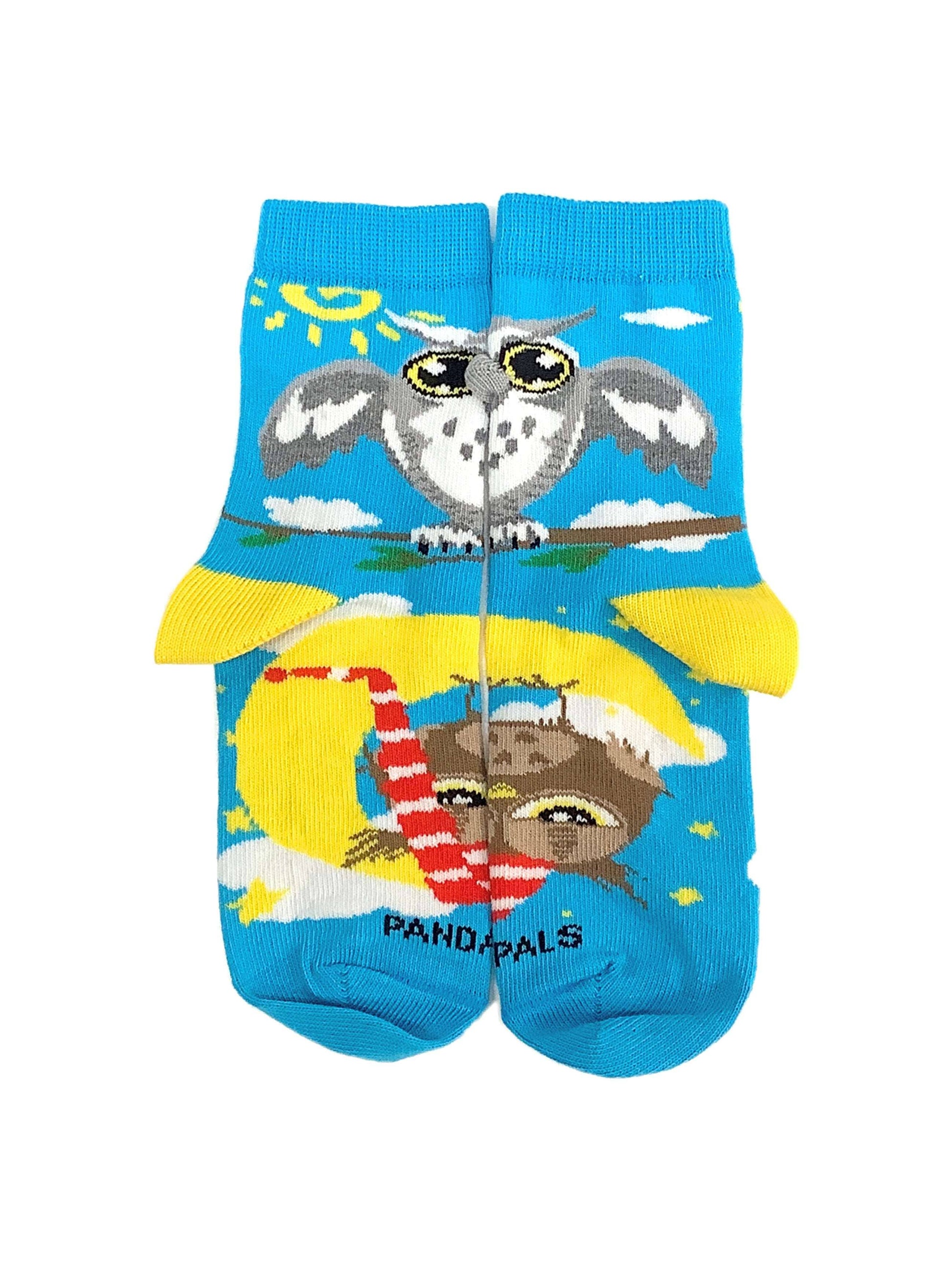 Hoot! Hoot! Day and night owl socks! Top half, the day owl looking at you with its bright eyes. On the bottom half, a sleepy night owl ready to go to bed. 3D design on its beak.