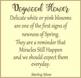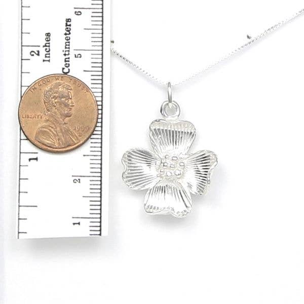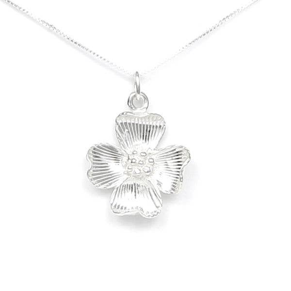 Sterling Silver Dogwood Flower Necklace is hand cast in Sterling Silver and includes chain, gift box story card and artist bio.