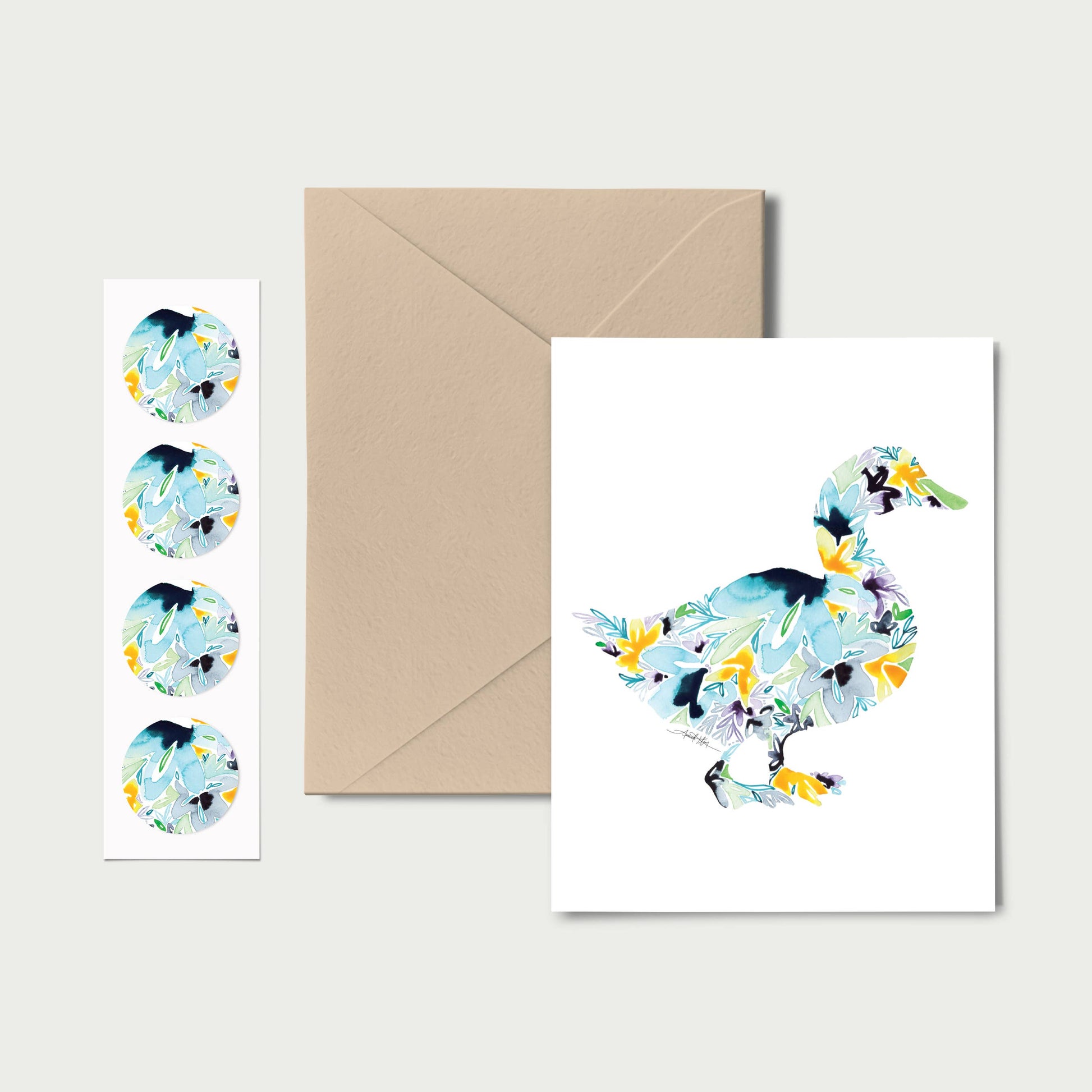 This duck note card box set features 8 blank notecards, kraft envelopes and envelope stickers. The original cardinal piece was created by hand in Amanda Klein’s signature floral style using liquid watercolor and acrylic ink.