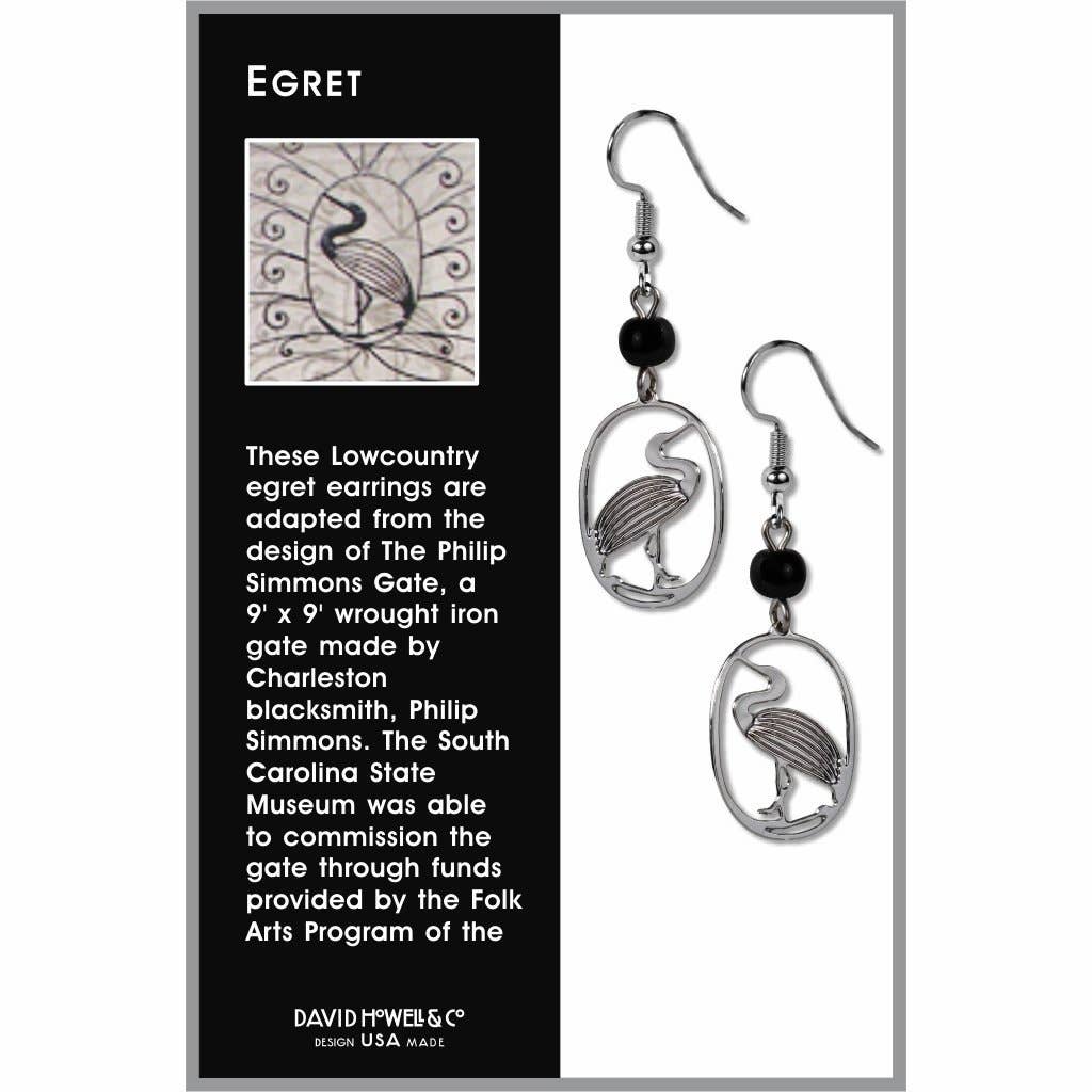 These lowcountry egret earrings are adapted from the design of the philip simmons gate, a 9 x 9 wrought iron gate made by charleston blacksmith, philip simmons. Mr simmons has spent over sixty years creating forms from iron. This double gate features a palmetto tree and two lowcountry egrets.