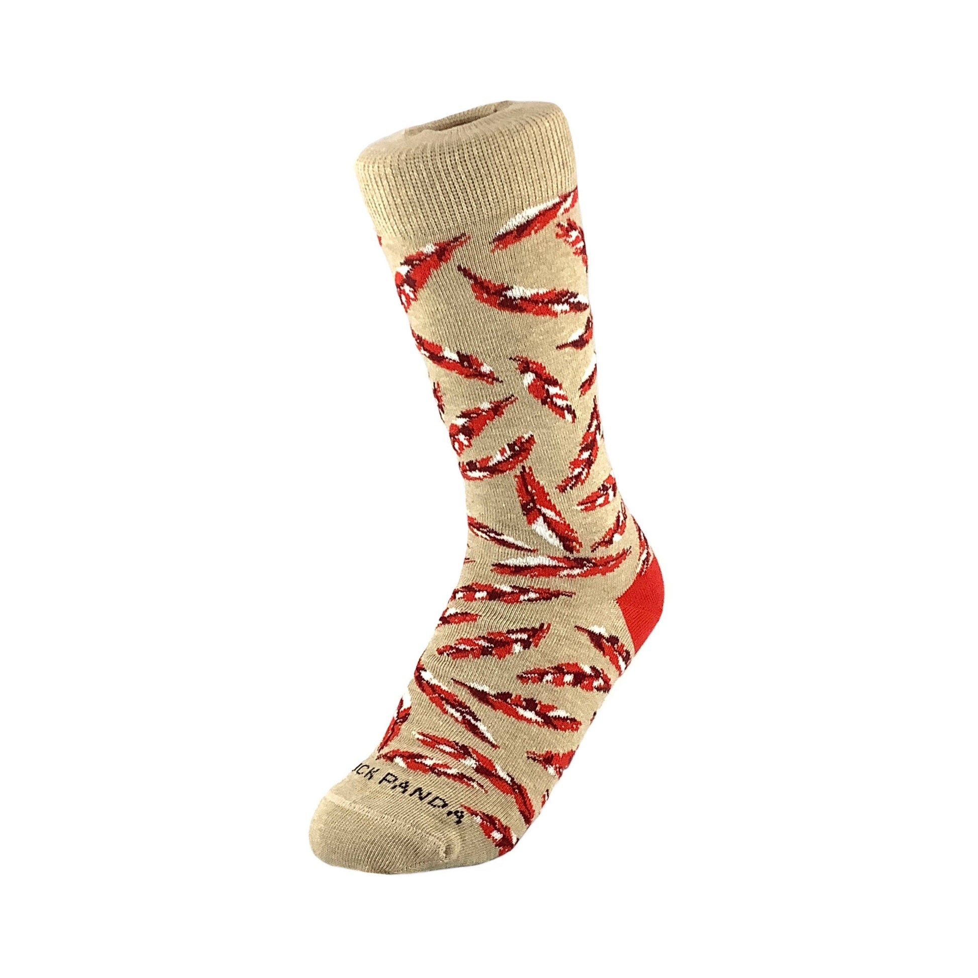 Cool red fall feathers patterned on tan socks.