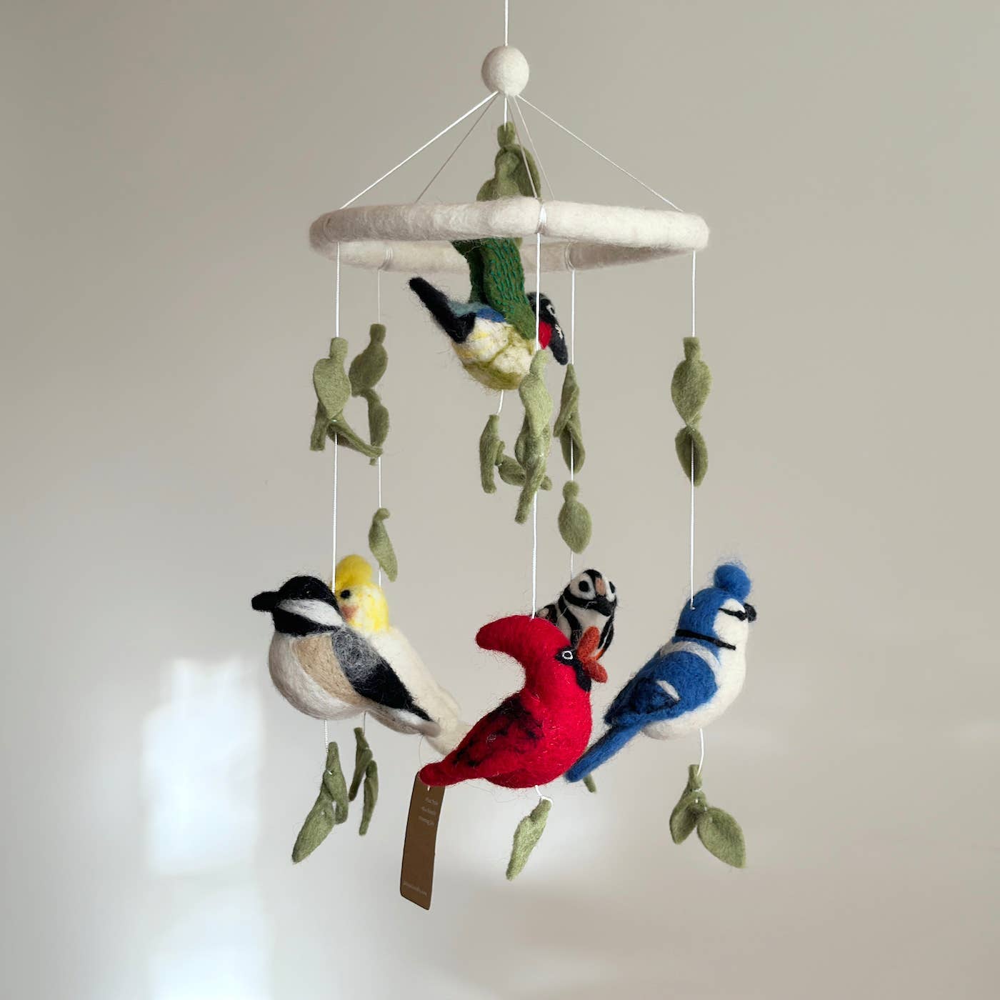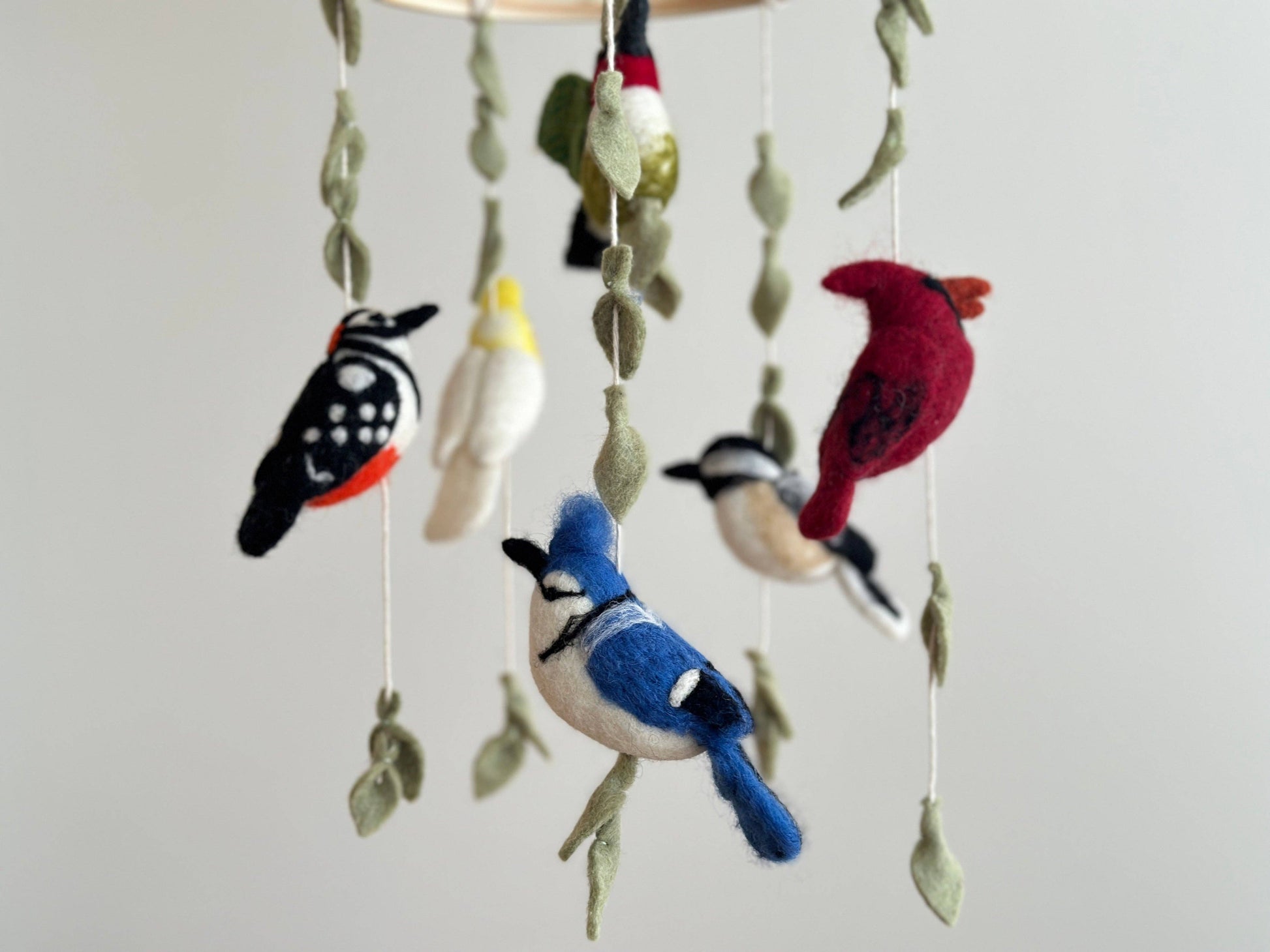 Experience the beauty of American skies with our "American Bird Mobile." Featuring iconic birds like the cardinal, hummingbird, blue jay, chickadee, woodpecker, and parrot, adorned with decorative leaves, all showcased on a felt frame. Hang this mobile and let the vibrant colors and diverse avian world enchant your space, celebrating the winged wonders of the Americas.
