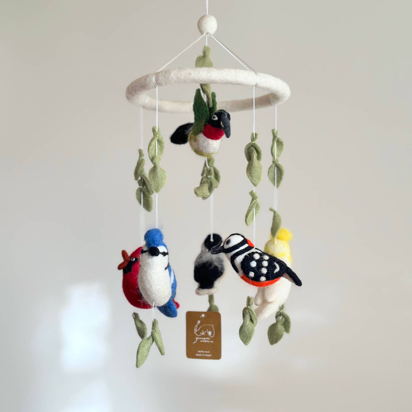 Handcrafted with natural, natural wool fibers and eco-friendly dyes. and suspended from a felt hoop for gentle movement. Safe for baby's room.