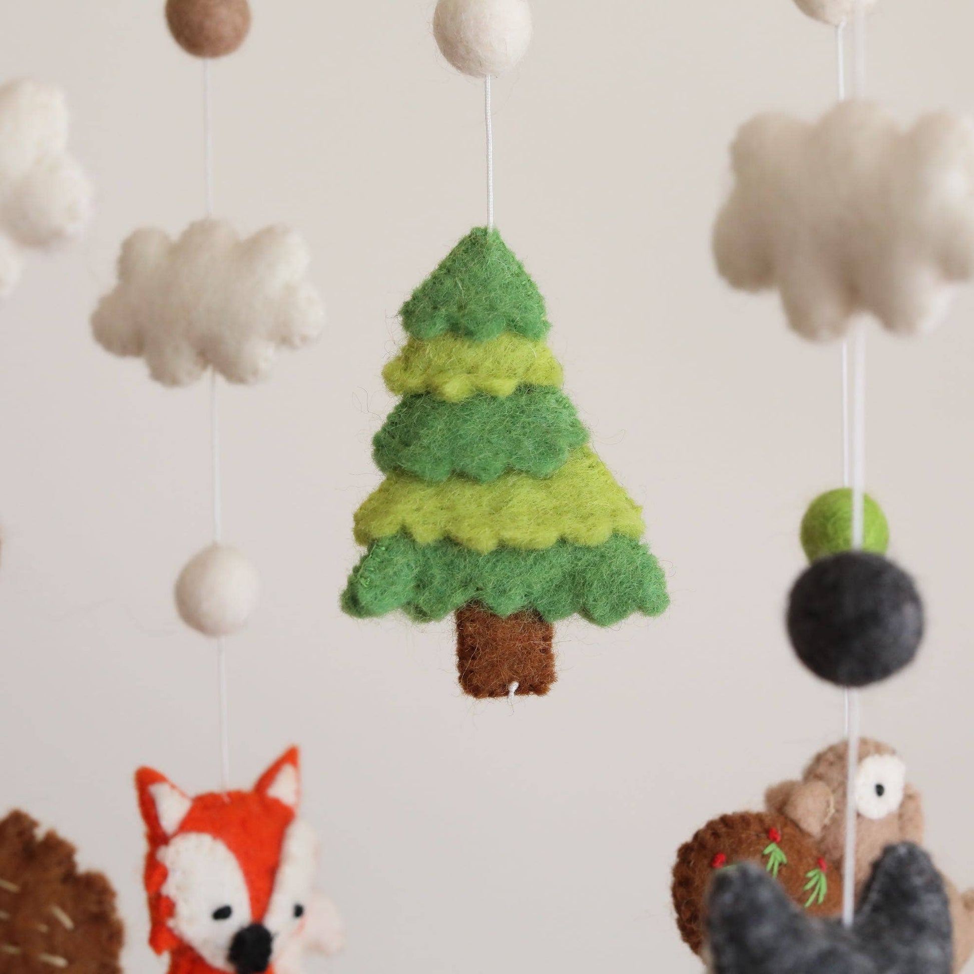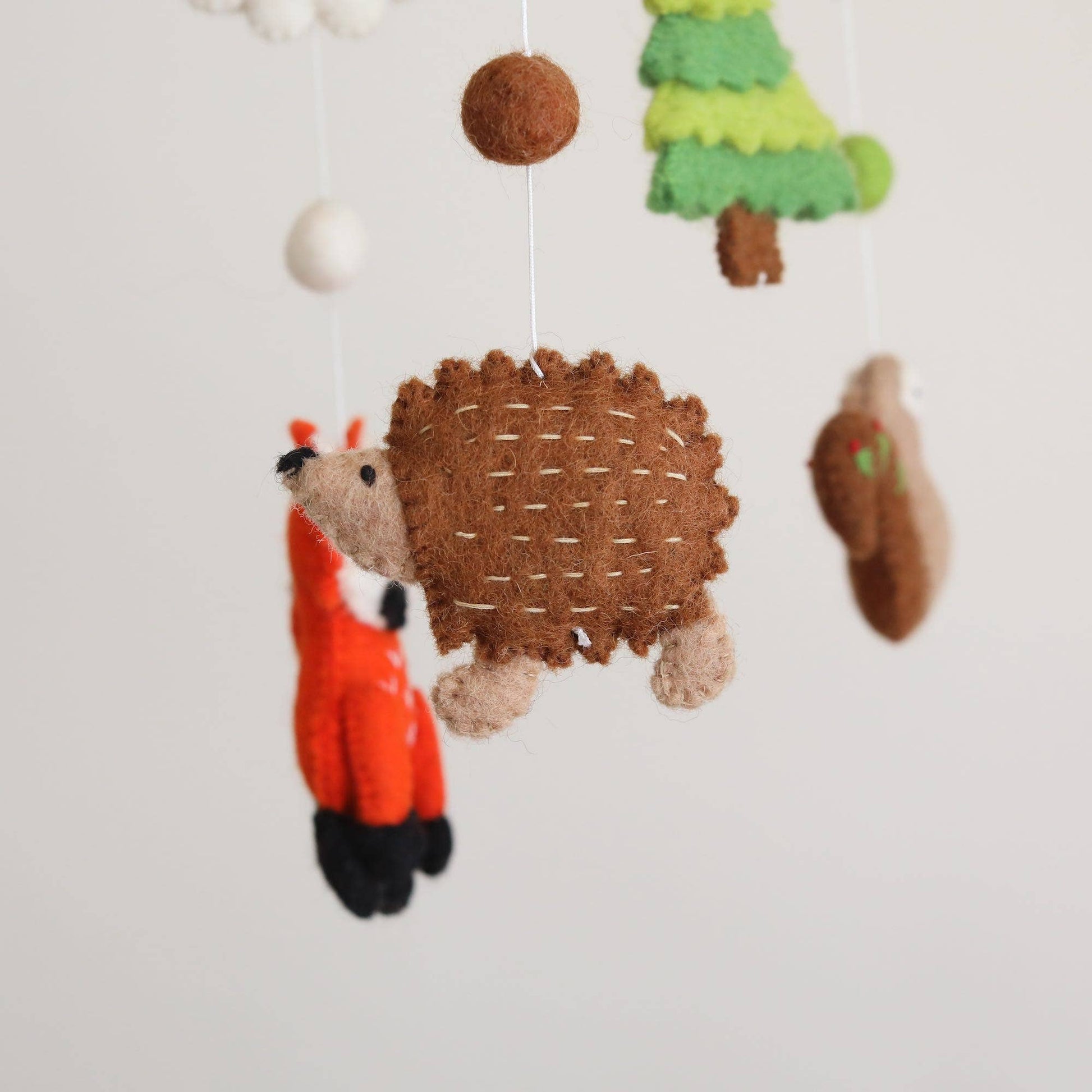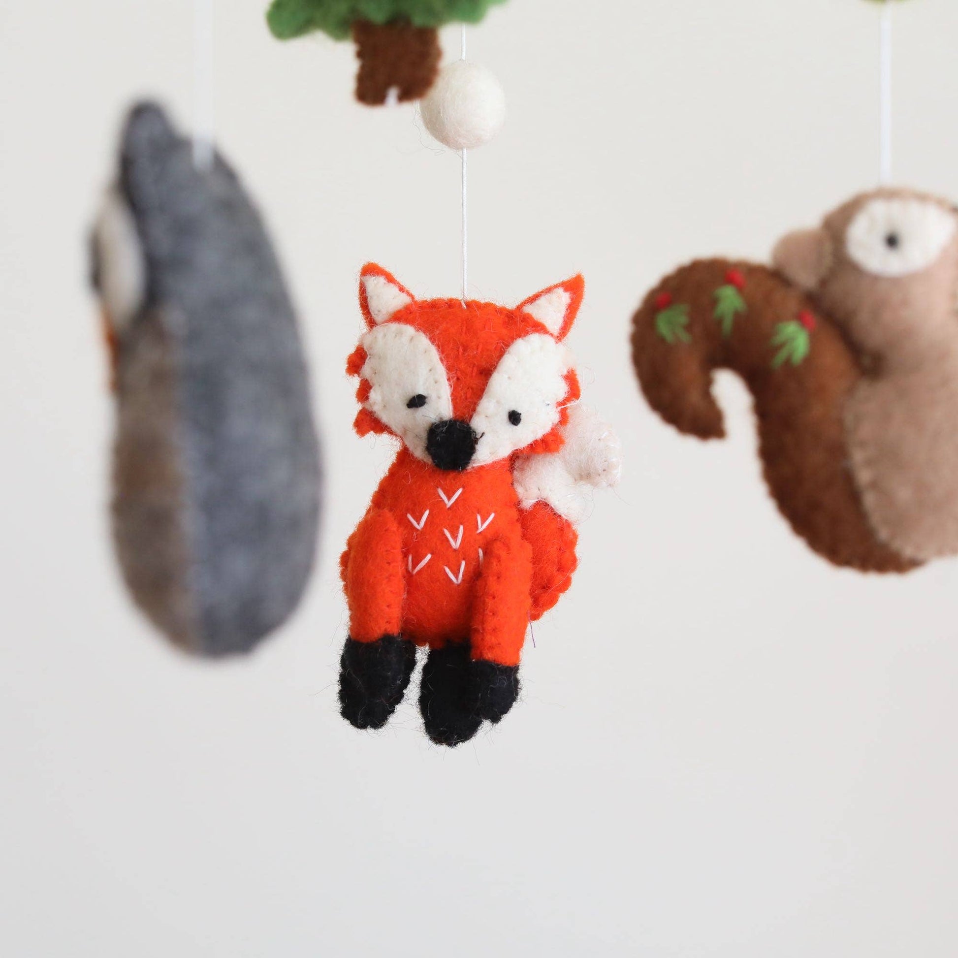 Infuse your baby's room with a touch of woodland magic through our Woodland Animal Mobile! This handcrafted wool felt baby mobile effortlessly transports the enchanting woodland world into your nursery. Hanging delicately from a felt hoop for soothing movement, it showcases a daring hedgehog, adorable fox, majestic owl, pine tree, and charming squirrel. Elevate your baby's room with a sprinkle of enchantment – the Woodland Mobile!