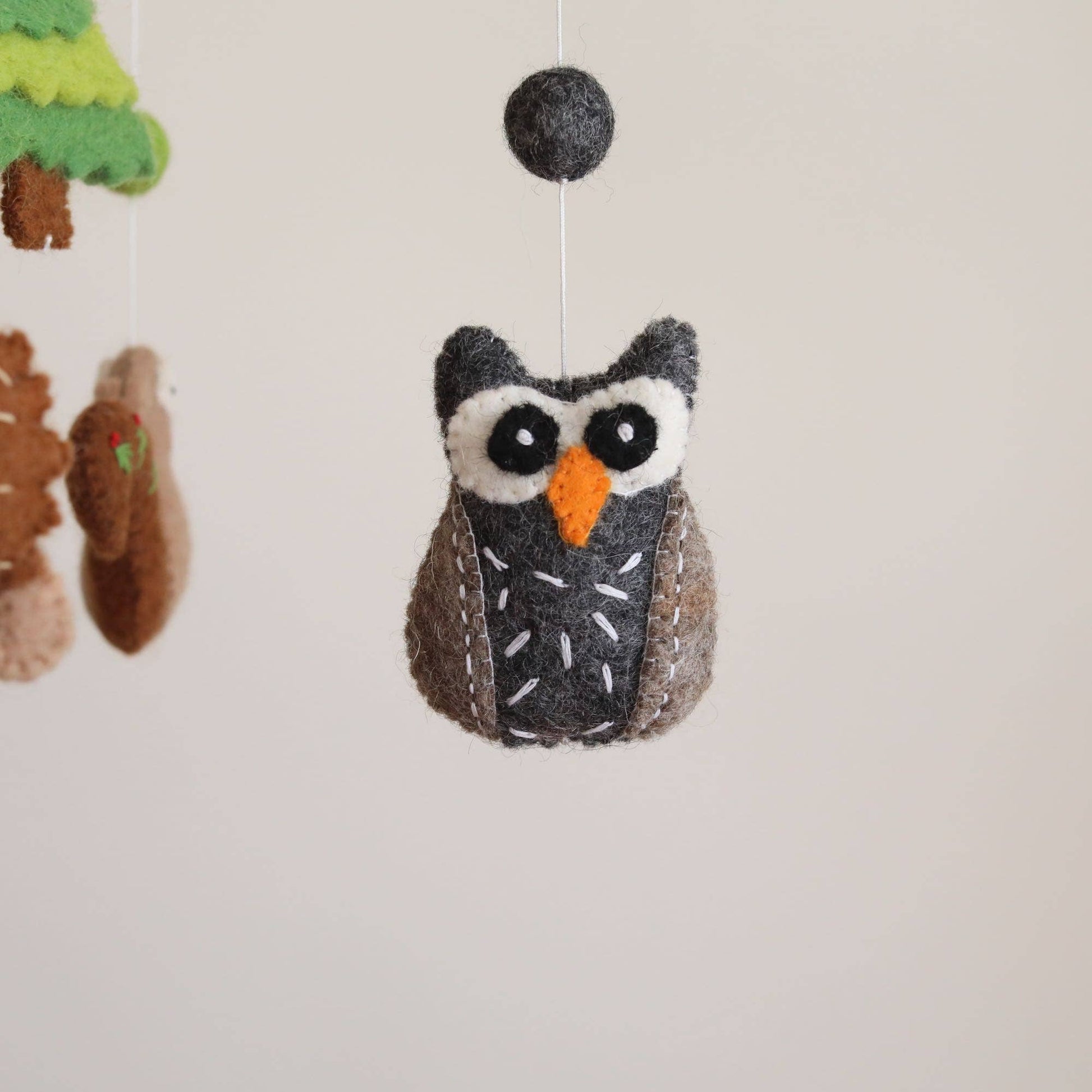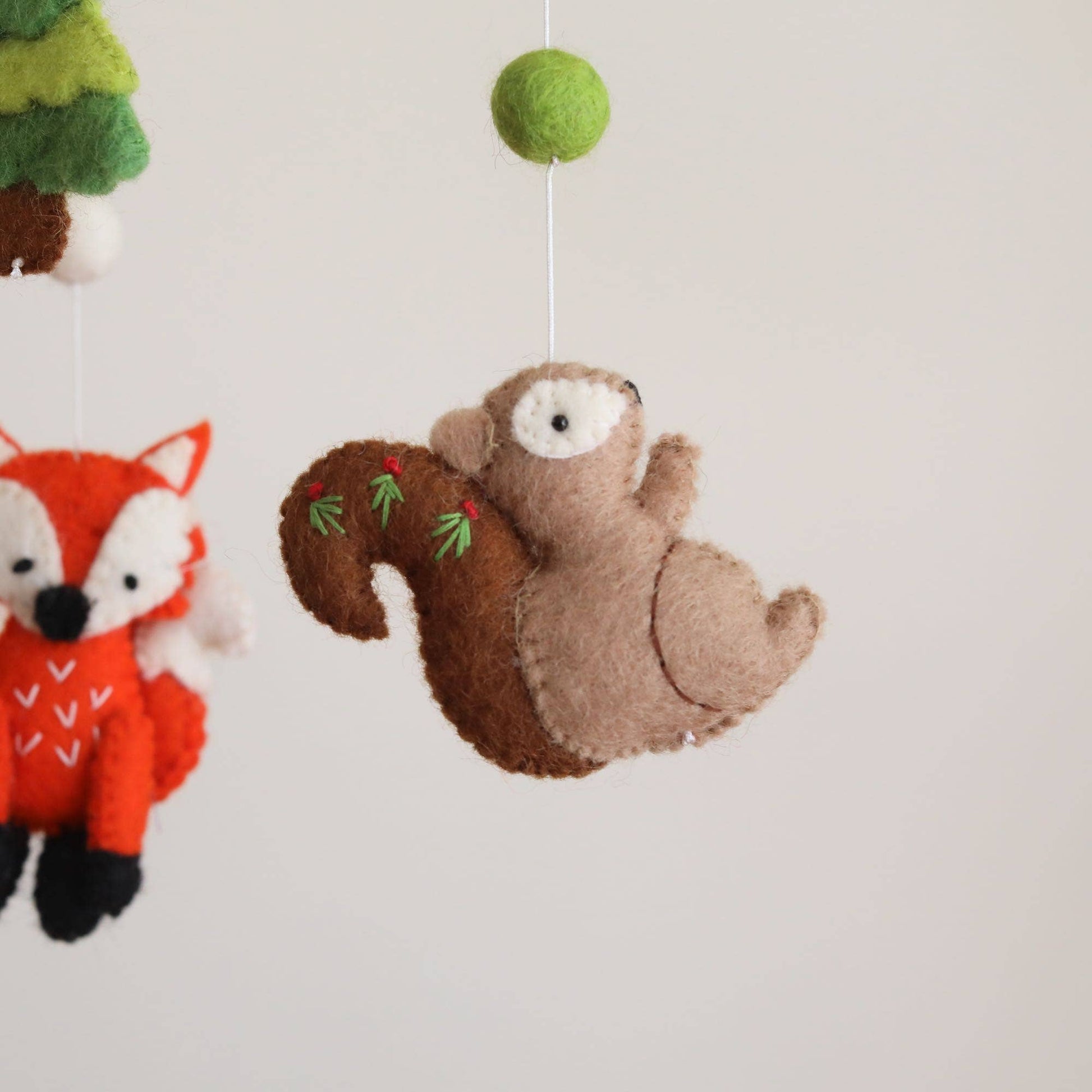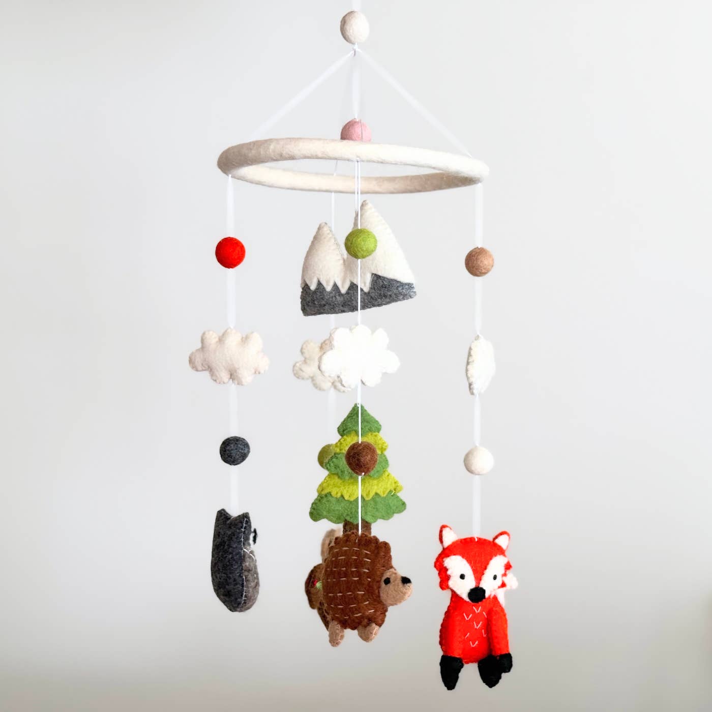 Infuse your baby's room with a touch of woodland magic through our Woodland Animal Mobile! This handcrafted wool felt baby mobile effortlessly transports the enchanting woodland world into your nursery. Hanging delicately from a felt hoop for soothing movement, it showcases a daring hedgehog, adorable fox, majestic owl, pine tree, and charming squirrel. Elevate your baby's room with a sprinkle of enchantment – the Woodland Mobile!