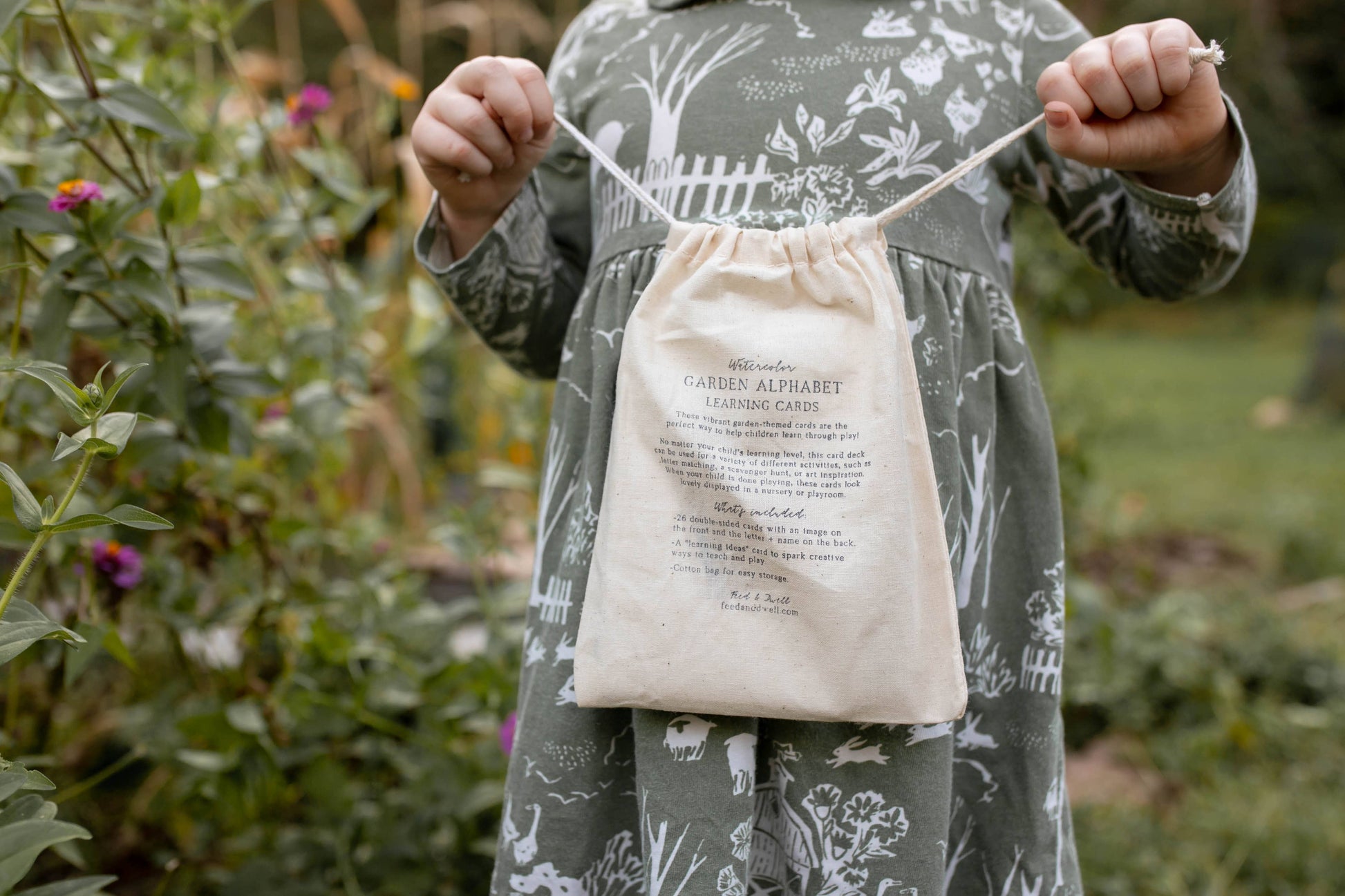 This listing includes 26, 4x6" double-sided cards (image on the front, letter + name on the back) and a "learning ideas" card to spark creative ways to teach and play. They are packaged in a hand-stamped cotton bag (see photos).