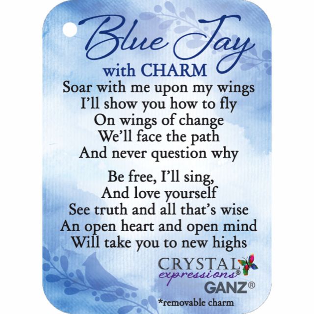 The Ganz Crystal Expressions Blue Jay with Charm Ornament has a removable charm with a poetic hanging tag.