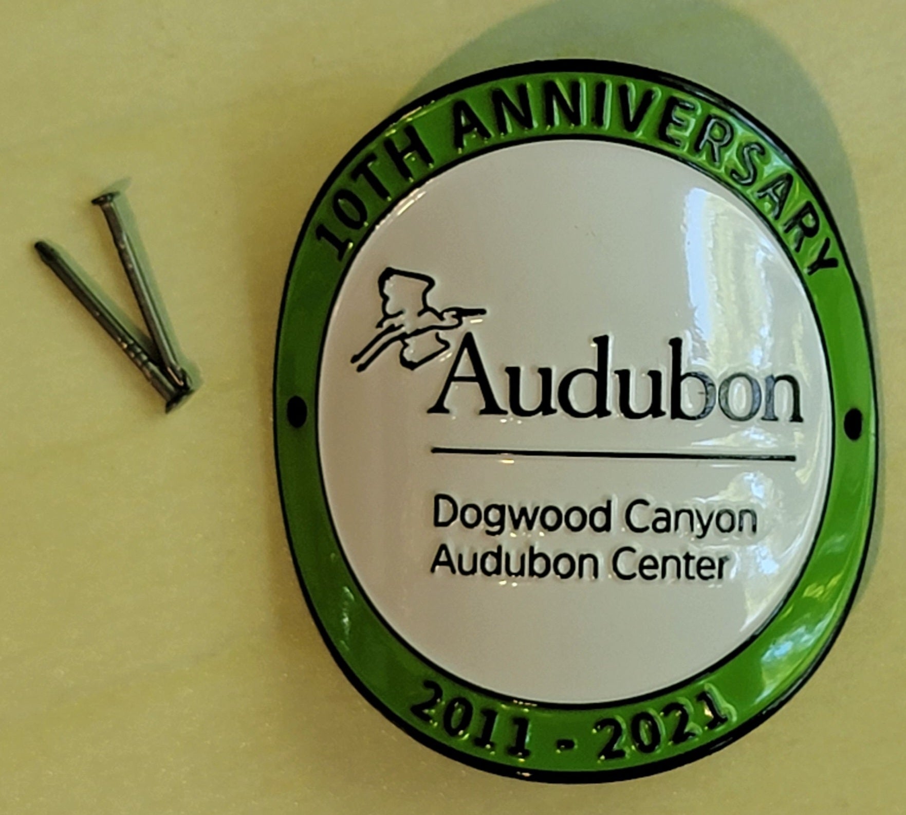 1.5" hiking/walking stick medallion - Dogwood Canyon Audubon Center logo in center on white background - Green border with "10th Anniversary 2011-2021"