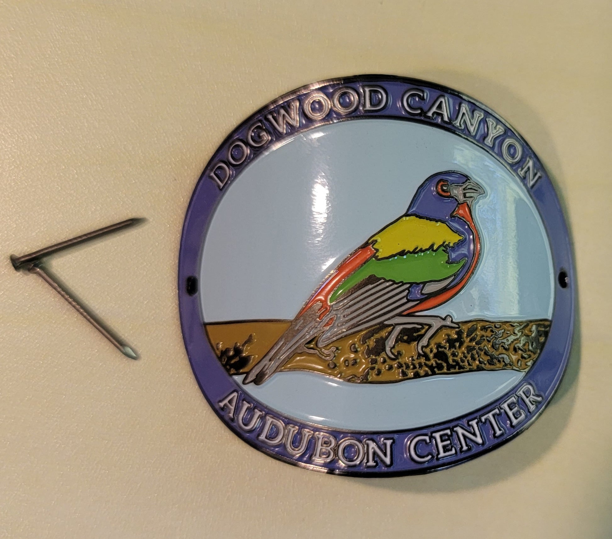 1.5" hiking/walking stick medallion - Painted bunting on branch with light blue background. Darker blue border with "Dogwood Canyon Audubon Center"