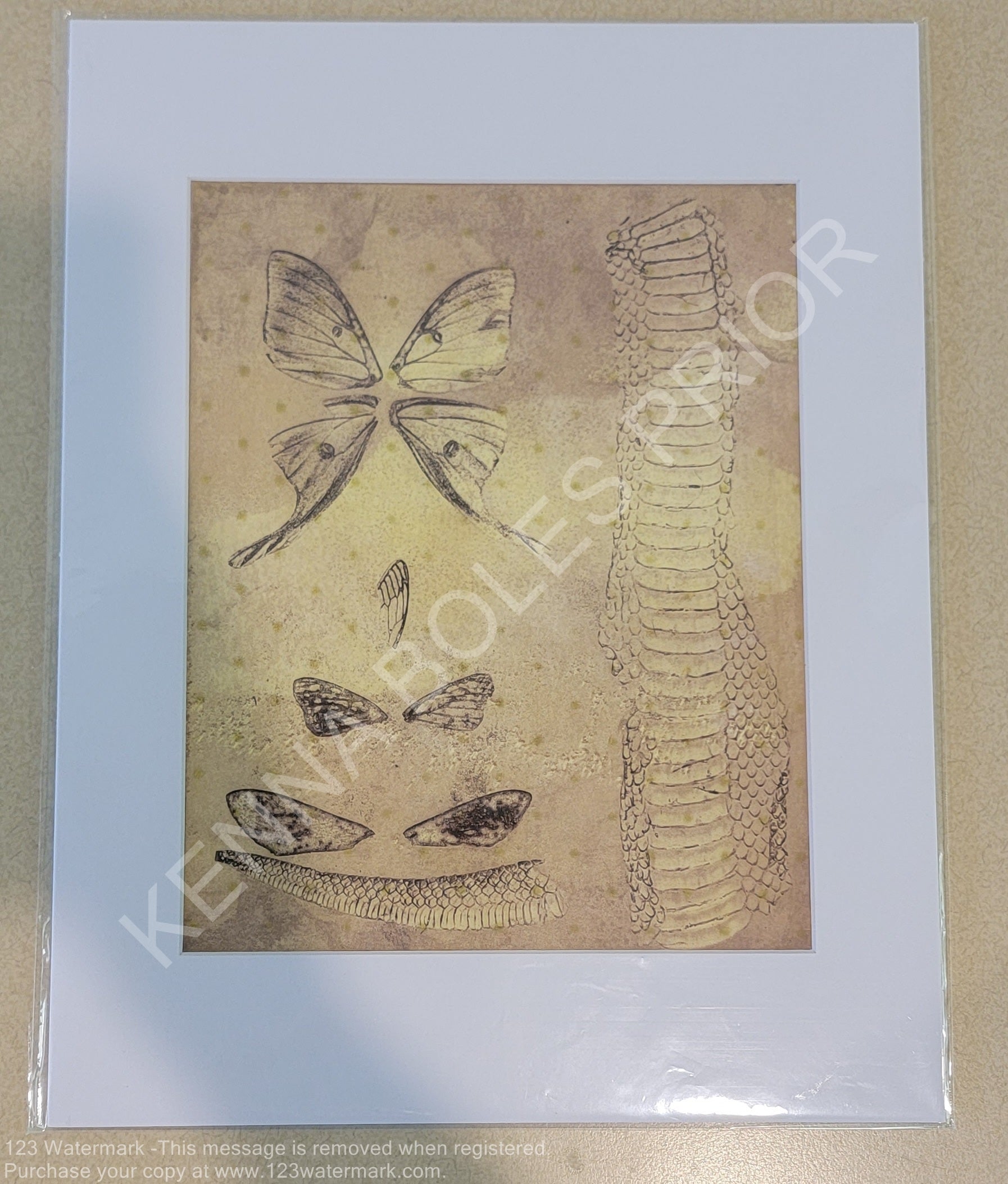 These photogravures are based on specimens collected at Dogwood Canyon Audubon Center, including wings of a Luna moth, insect wings, and a shed from our animal ambassador, Spot, a Speckled king snake.