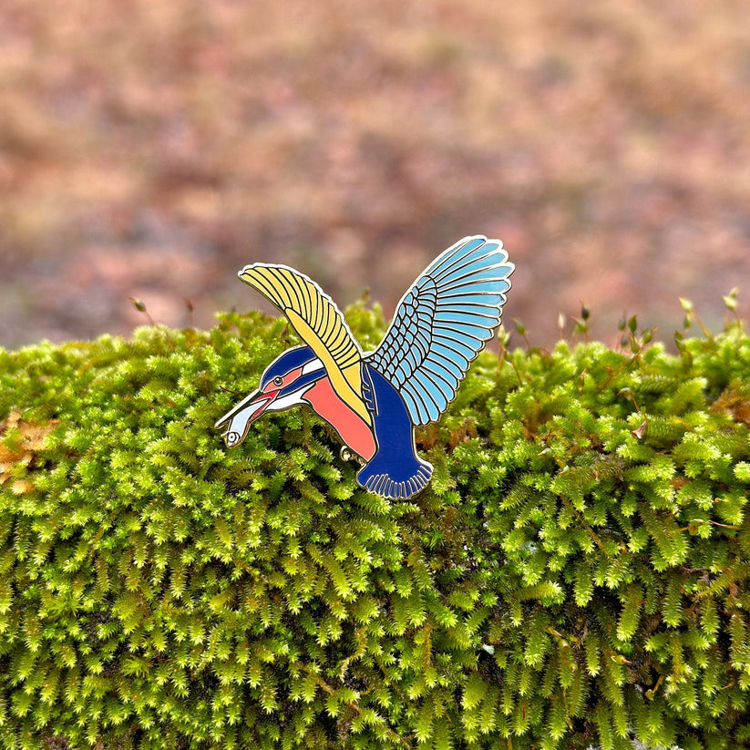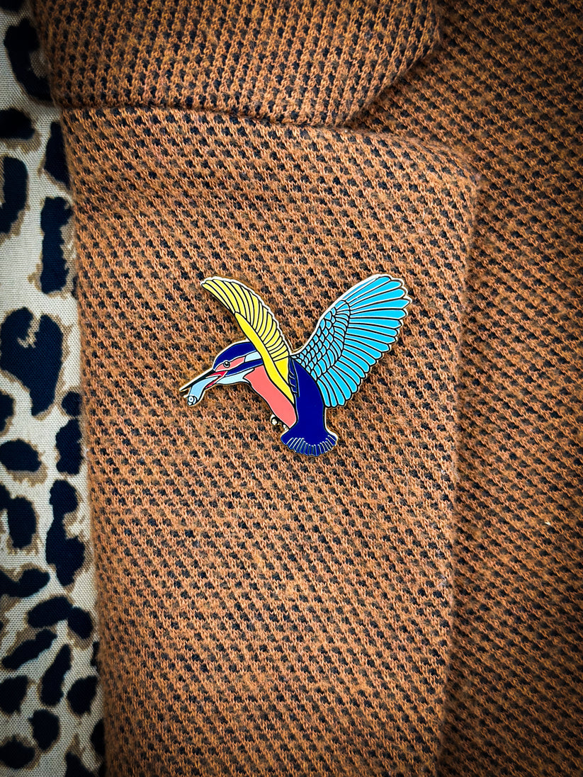 Featuring a kingfisher from our game Ecologies: Bizarre Biomes, we wanted to make a pin beautiful enough to be used as jewelry.