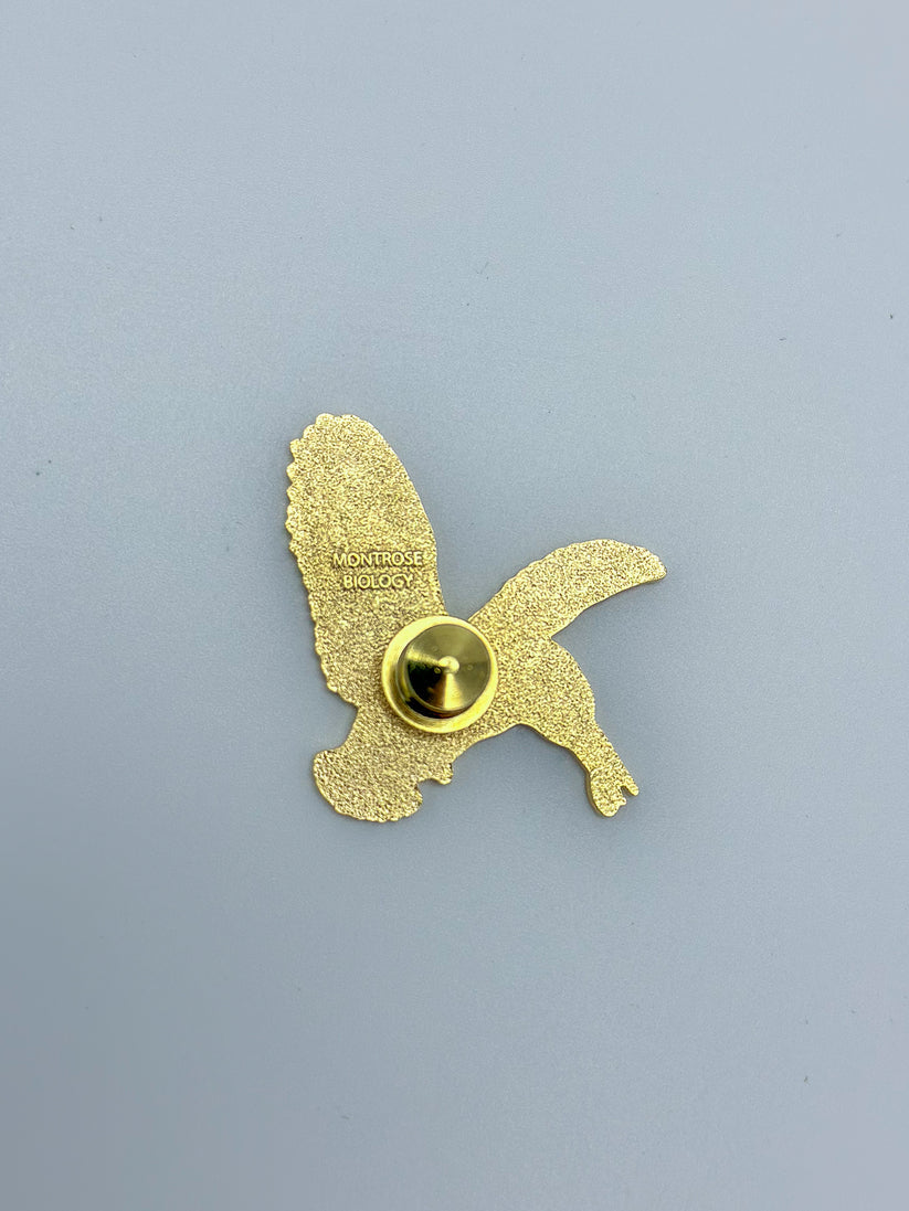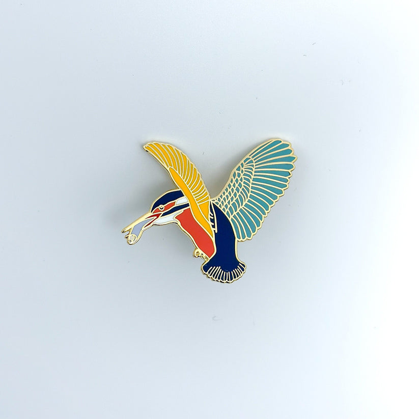 The pin measures 1.5 inches at its longest point and features 7 different shades of hard enamel. The kingfisher hovers mid-flight, holding a small fish in its beak.
