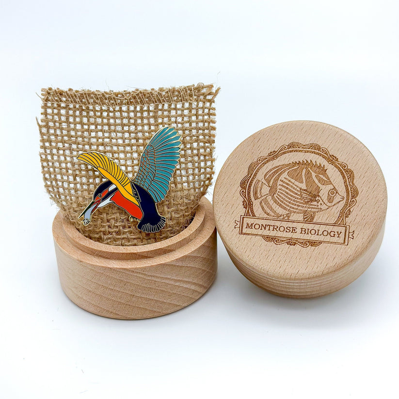 Lapel Pin - Kingfisher in Wooden Gift Box by Montrose Biology (Maker of Ecologies)