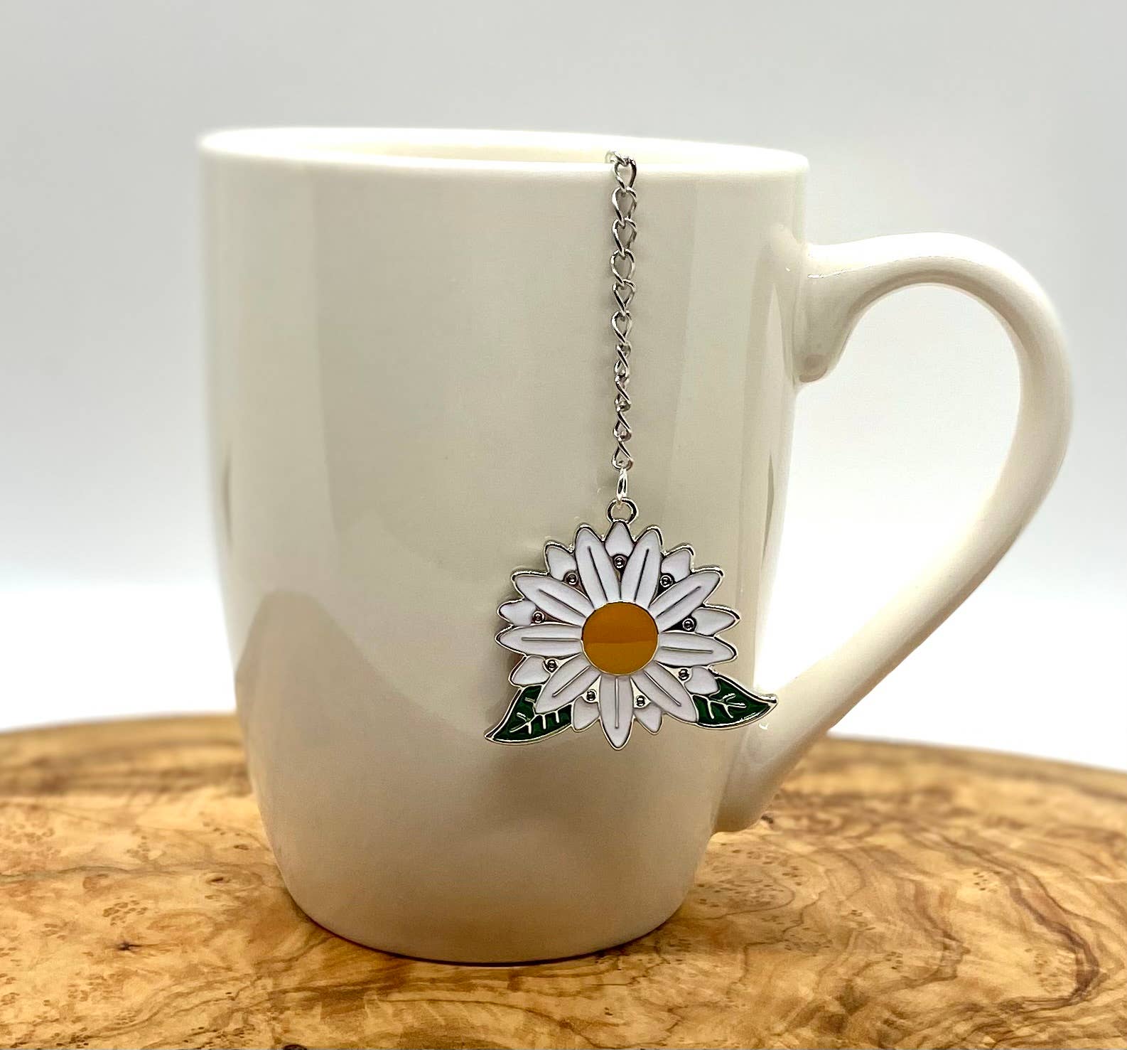The daisy charm hangs outside your teacup or teapot while the sturdy mesh ball sits inside infusing the piping hot water with a delicious surprise.