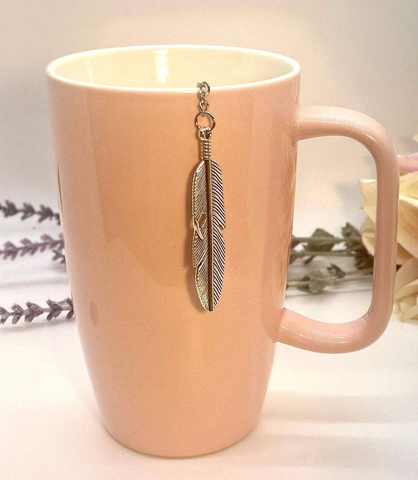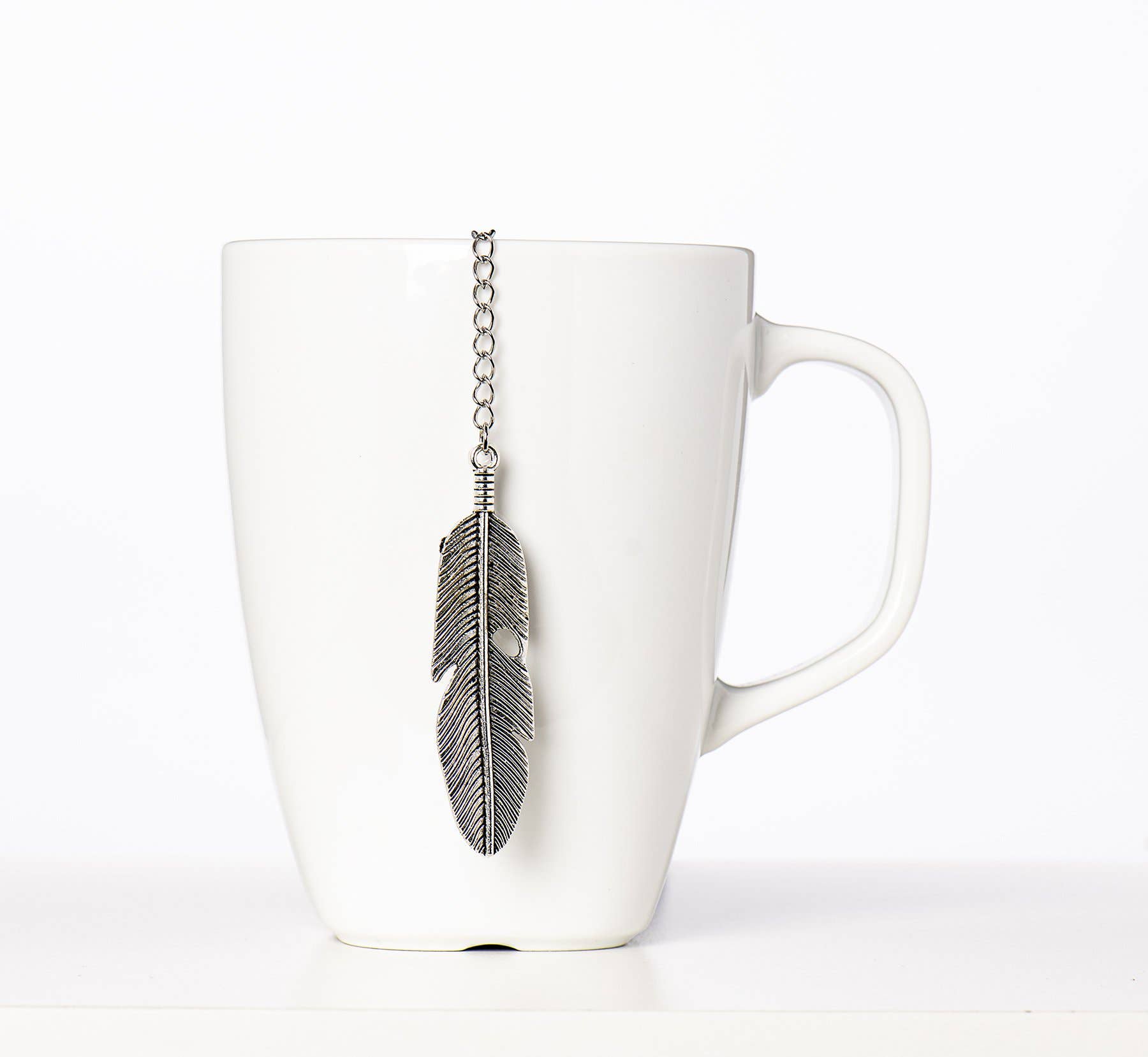 The silver feather charm hangs outside your teacup or teapot while the sturdy mesh ball sits inside infusing the piping hot water with a delicious surprise.