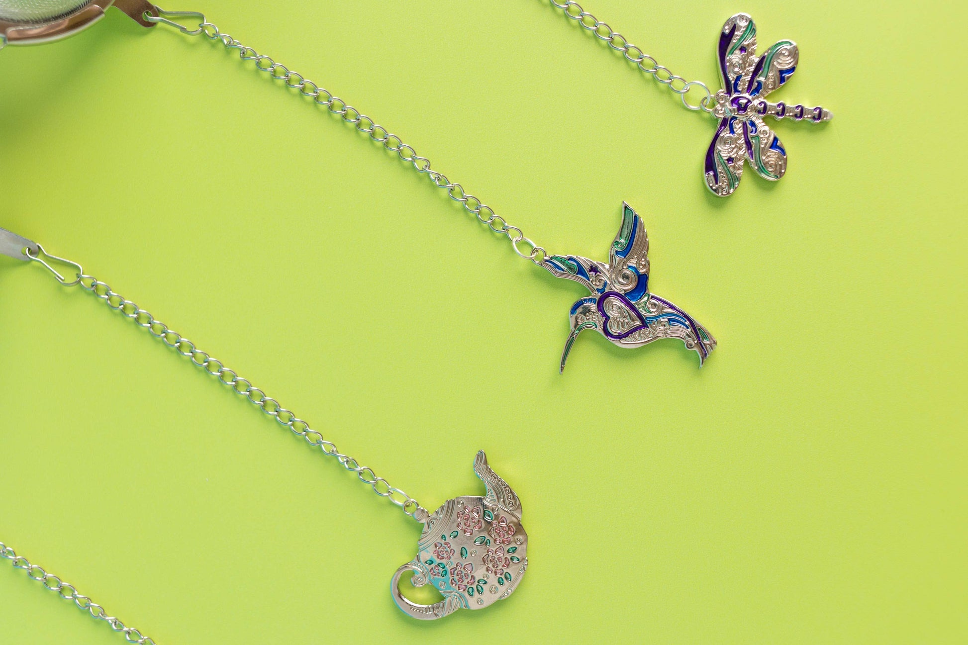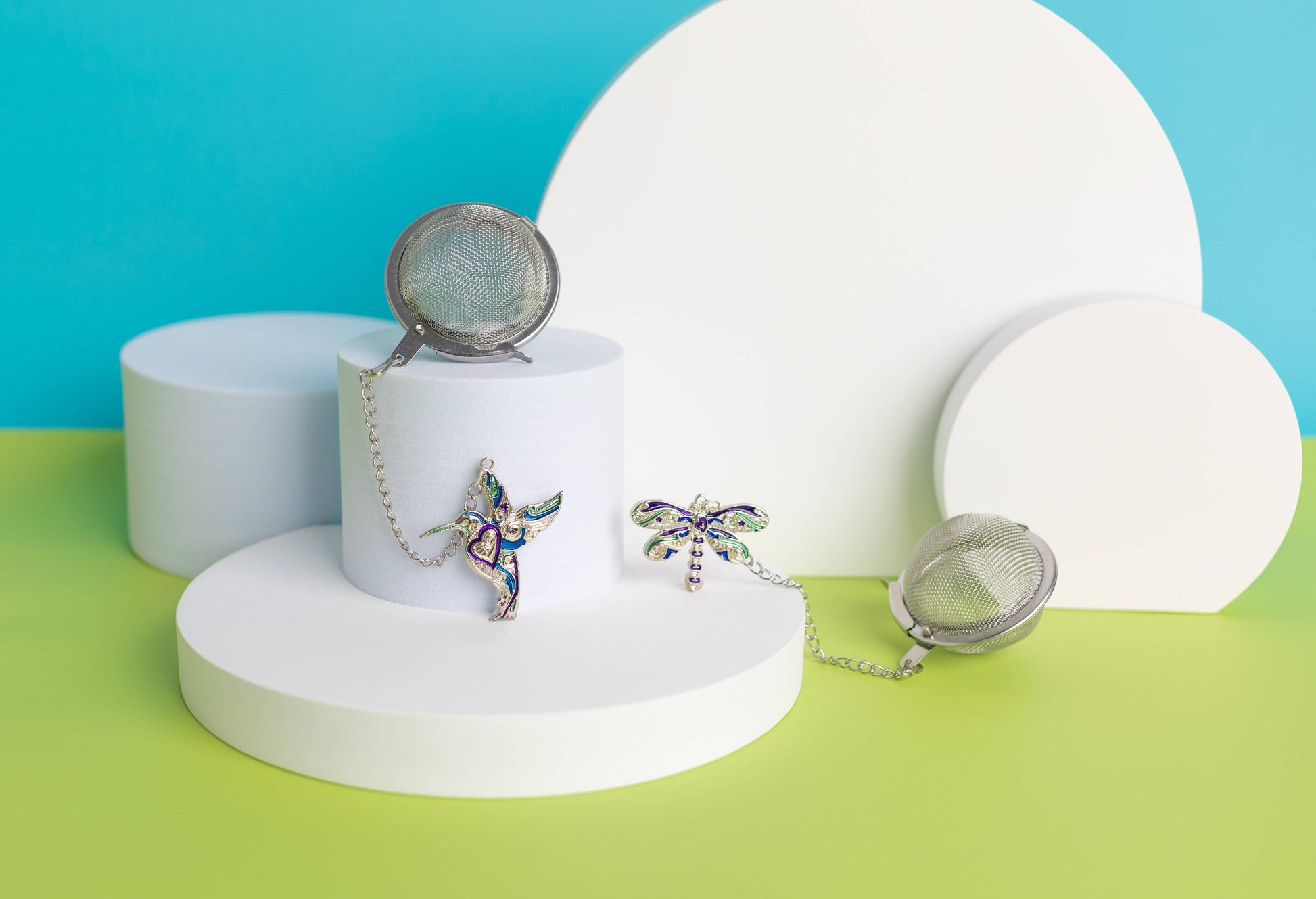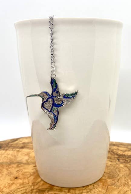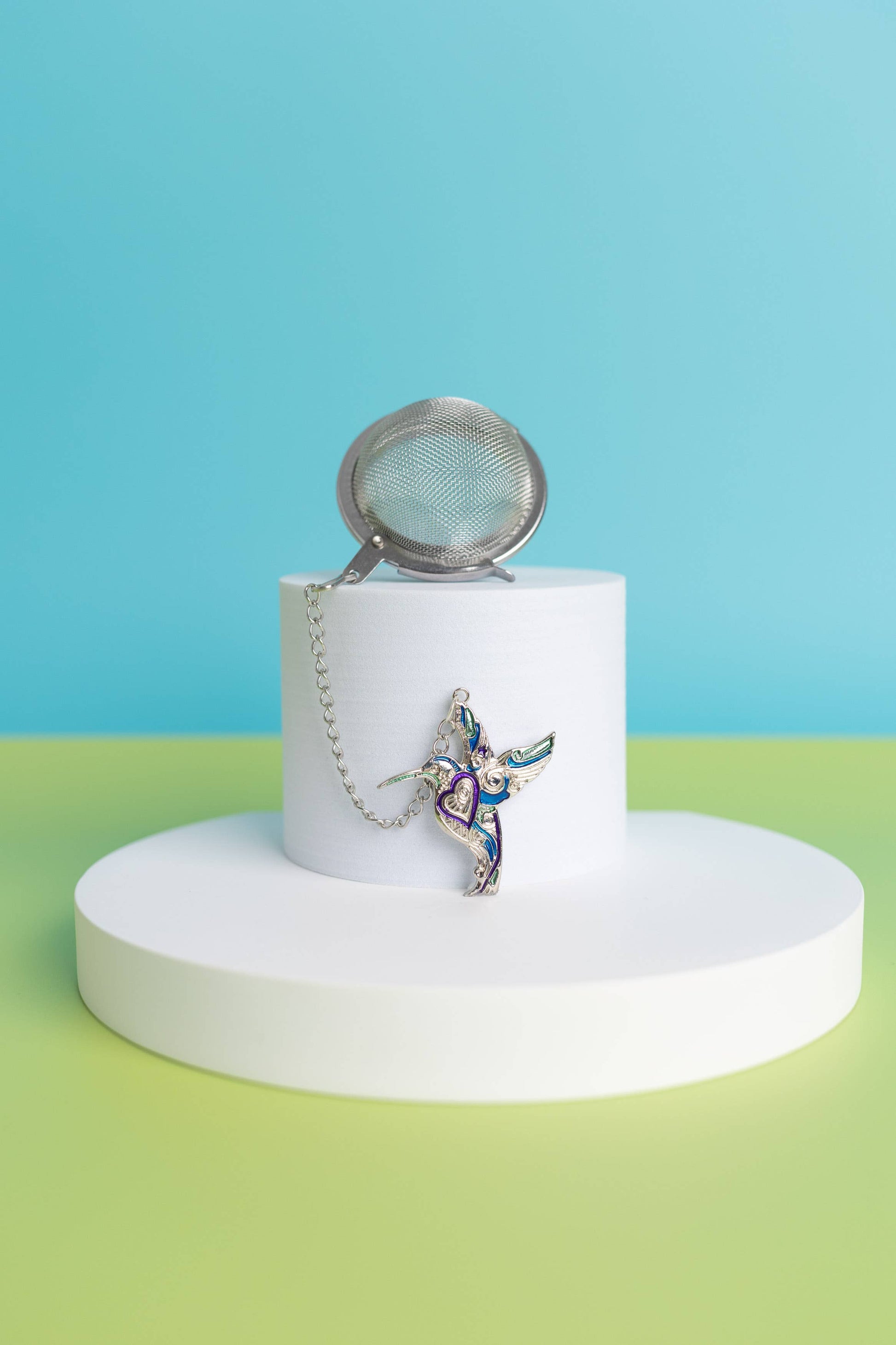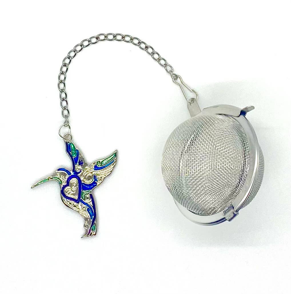 The delicate hummingbird charm which is accented with shades of blue, purple and green, hangs outside your teacup or teapot while the sturdy mesh ball sits inside infusing the piping hot water with a delicious surprise.