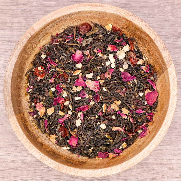 Ingredients: Organic jasmine green tea, organic rosehips, organic rose petals, organic orange pieces, natural essences.