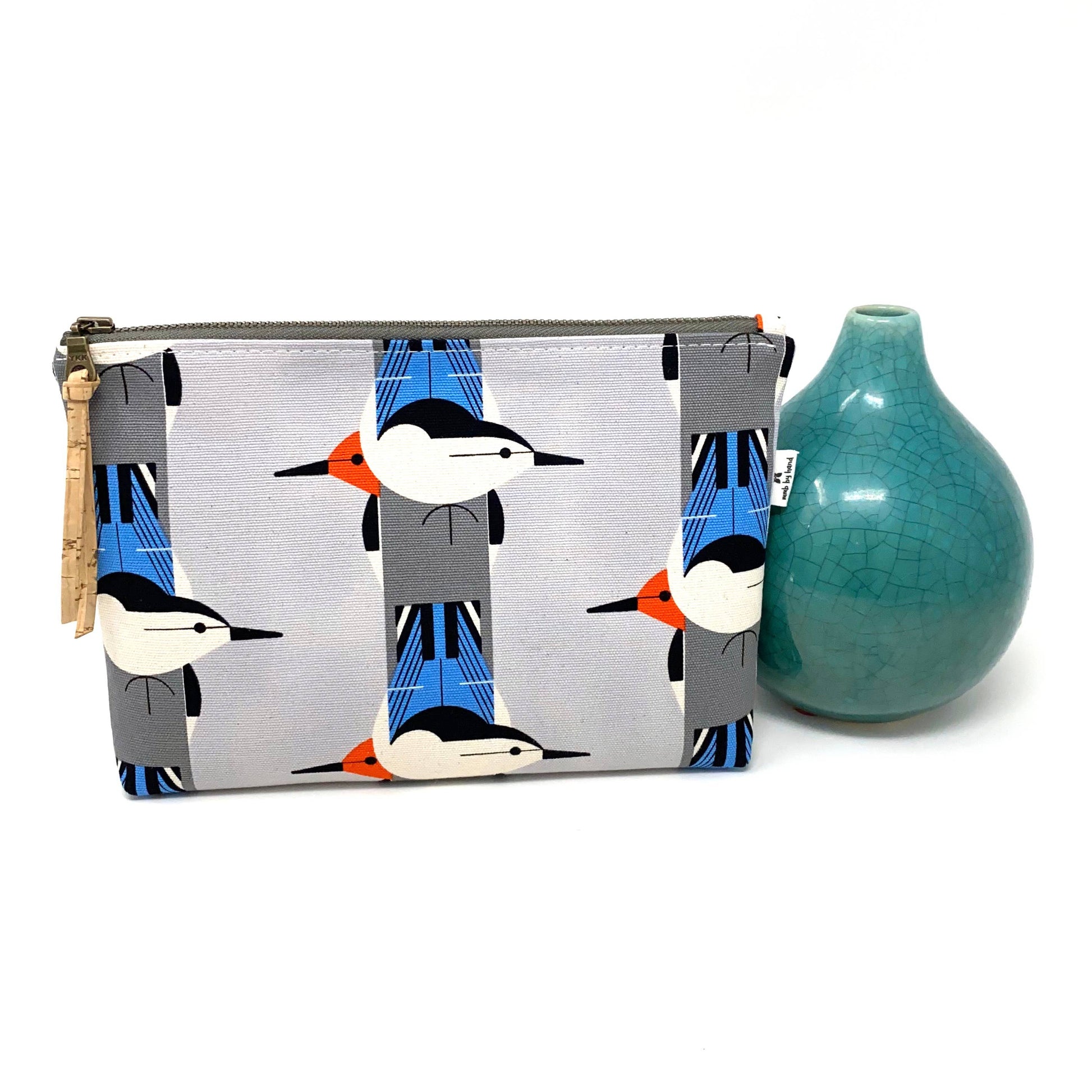 A sleek zippered pouch with a slimmer profile that’s just right for containing all the small things and slipping into a purse or larger bag. Made out of a lightweight, organic cotton canvas, front and back are identical. Print designed by famed mid-century artist, Charley Harper.