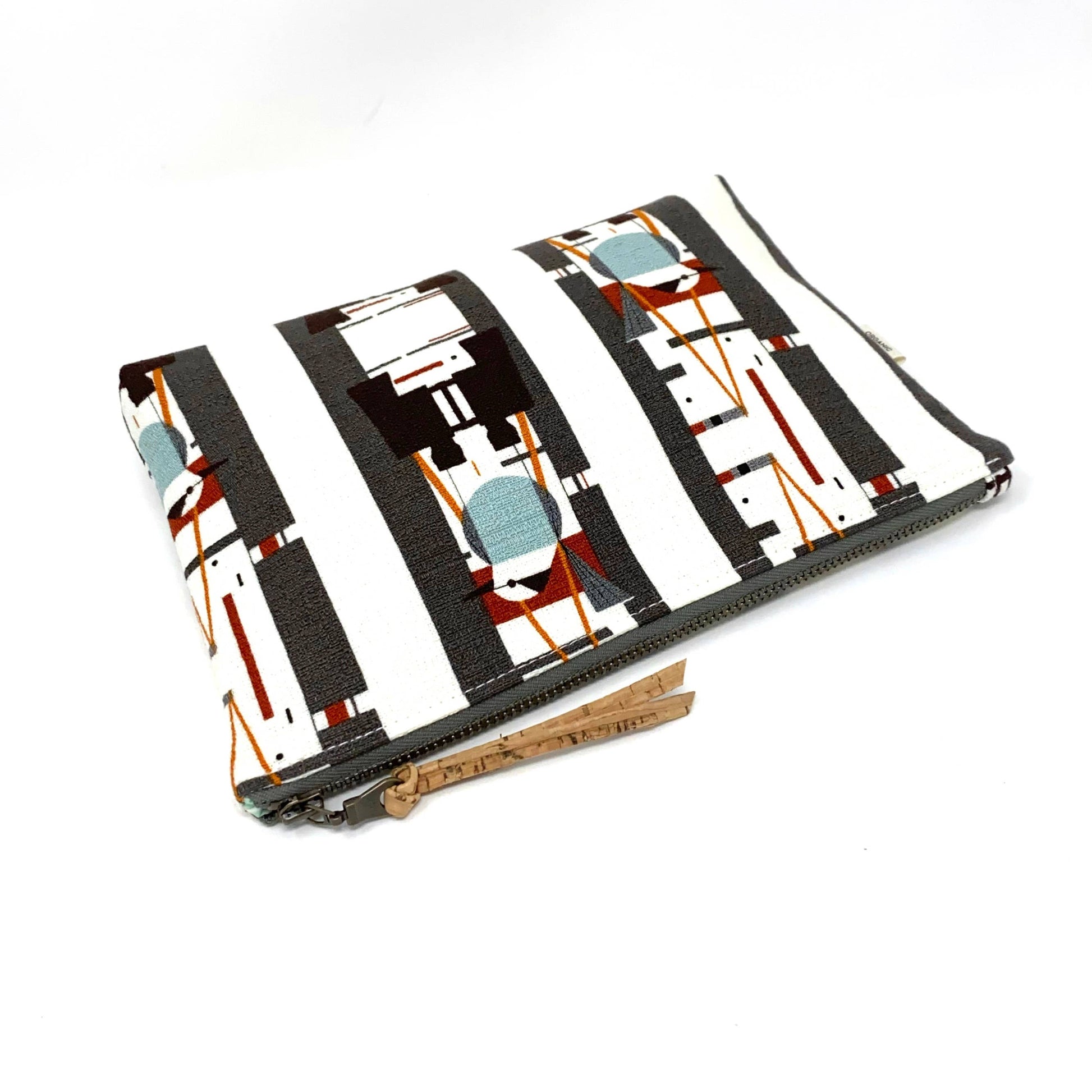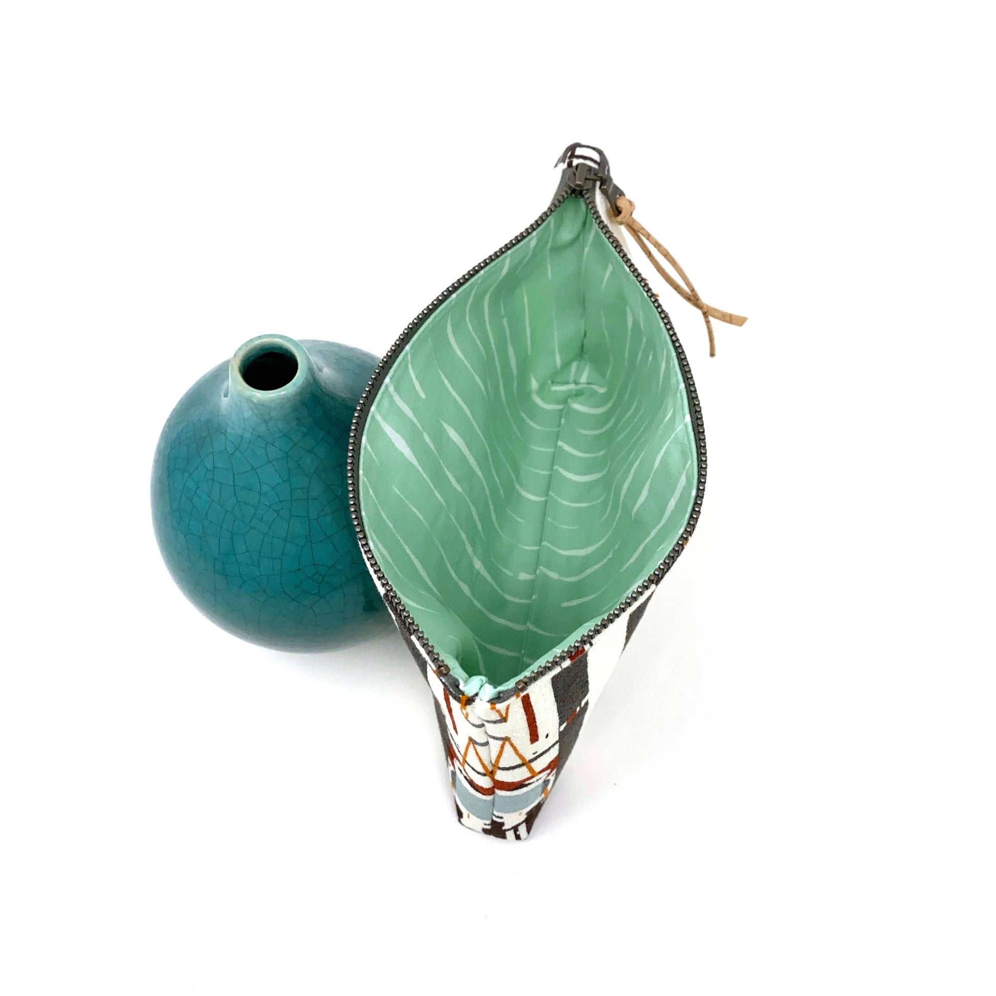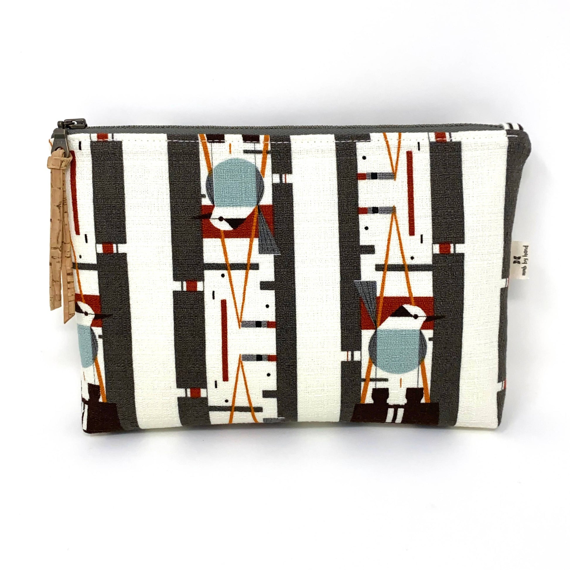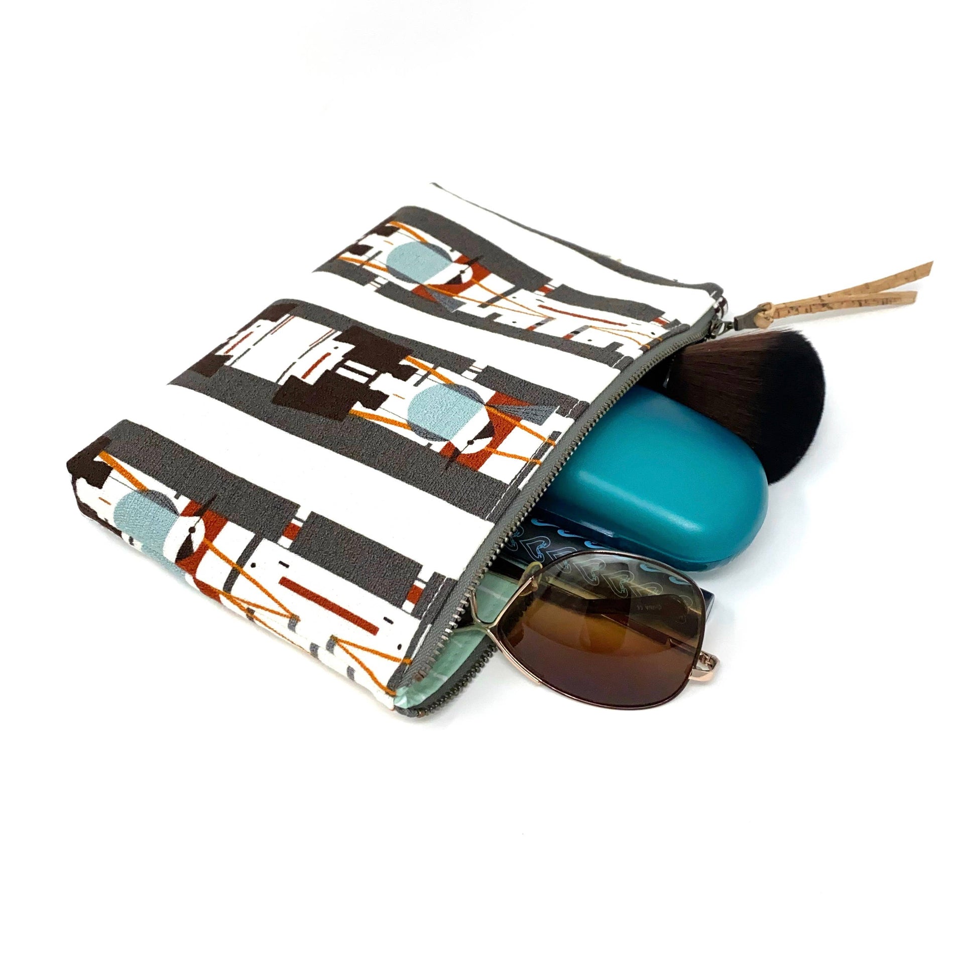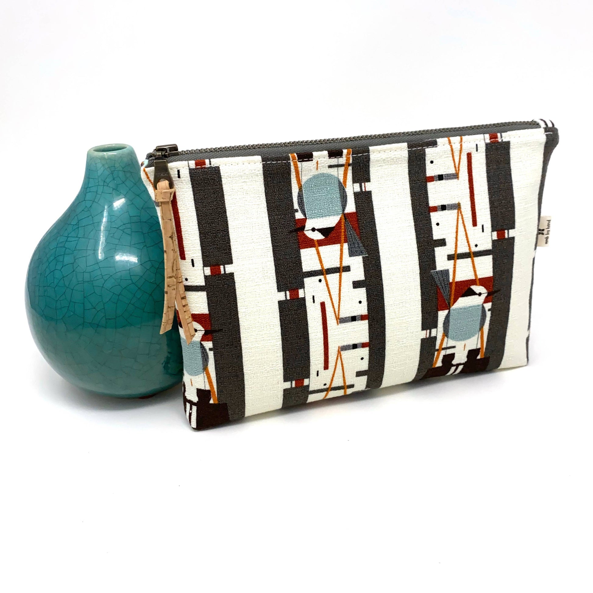 A sleek zippered pouch with a slimmer profile that’s just right for containing all the small things and slipping into a purse or larger bag. Made out of a retro organic cotton barkcloth, front and back are identical. Print designed by famed mid-century artist, Charley Harper.