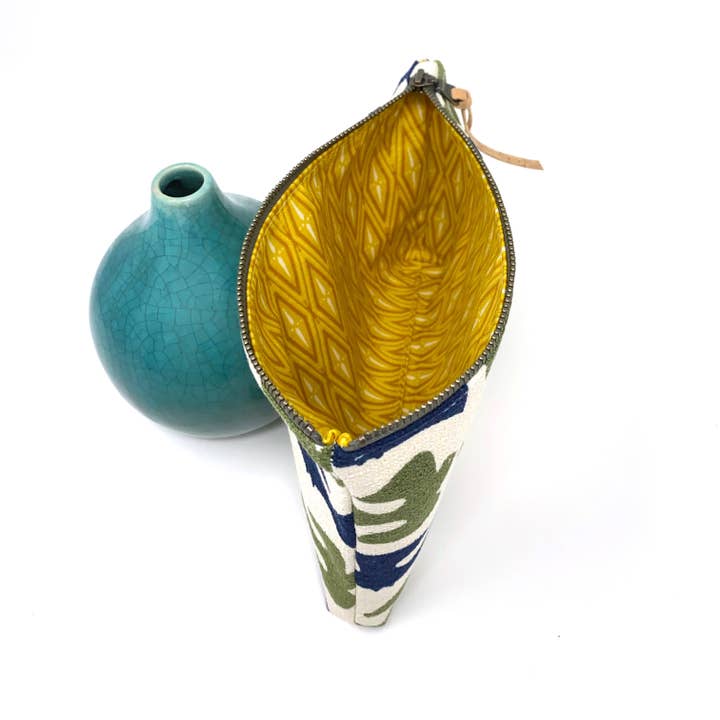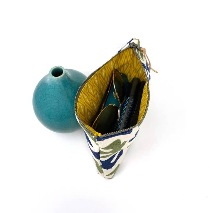 A sleek zippered pouch with a slimmer profile that’s just right for containing all the small things and slipping into a purse or larger bag. Made out of a lightweight, organic cotton barkcloth, front and back are identical.