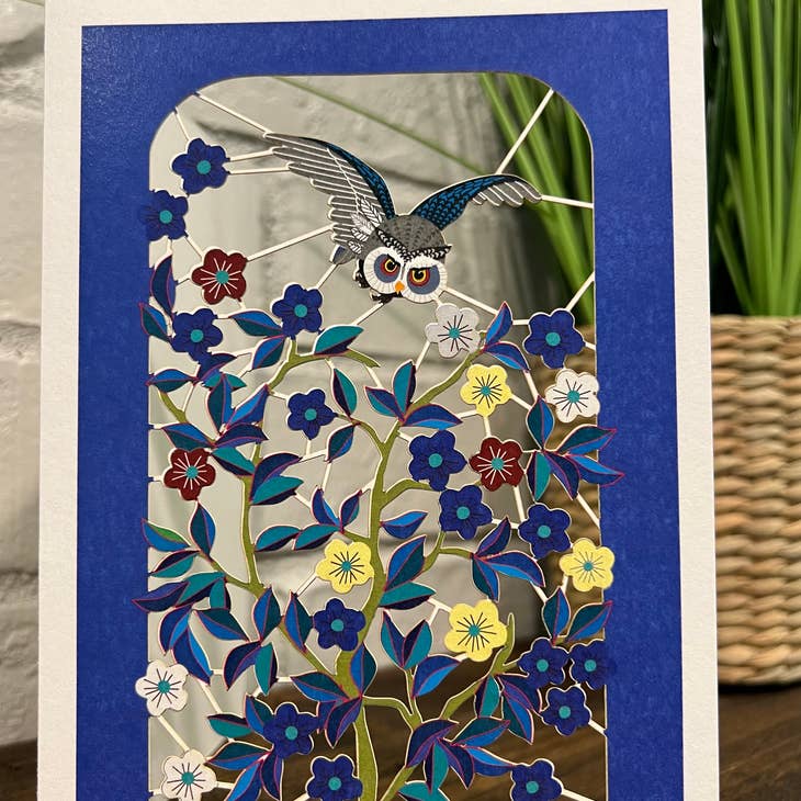 Greeting Card - Laser Cut & Frameable - Owl Flying Over Flowers (Single Card)