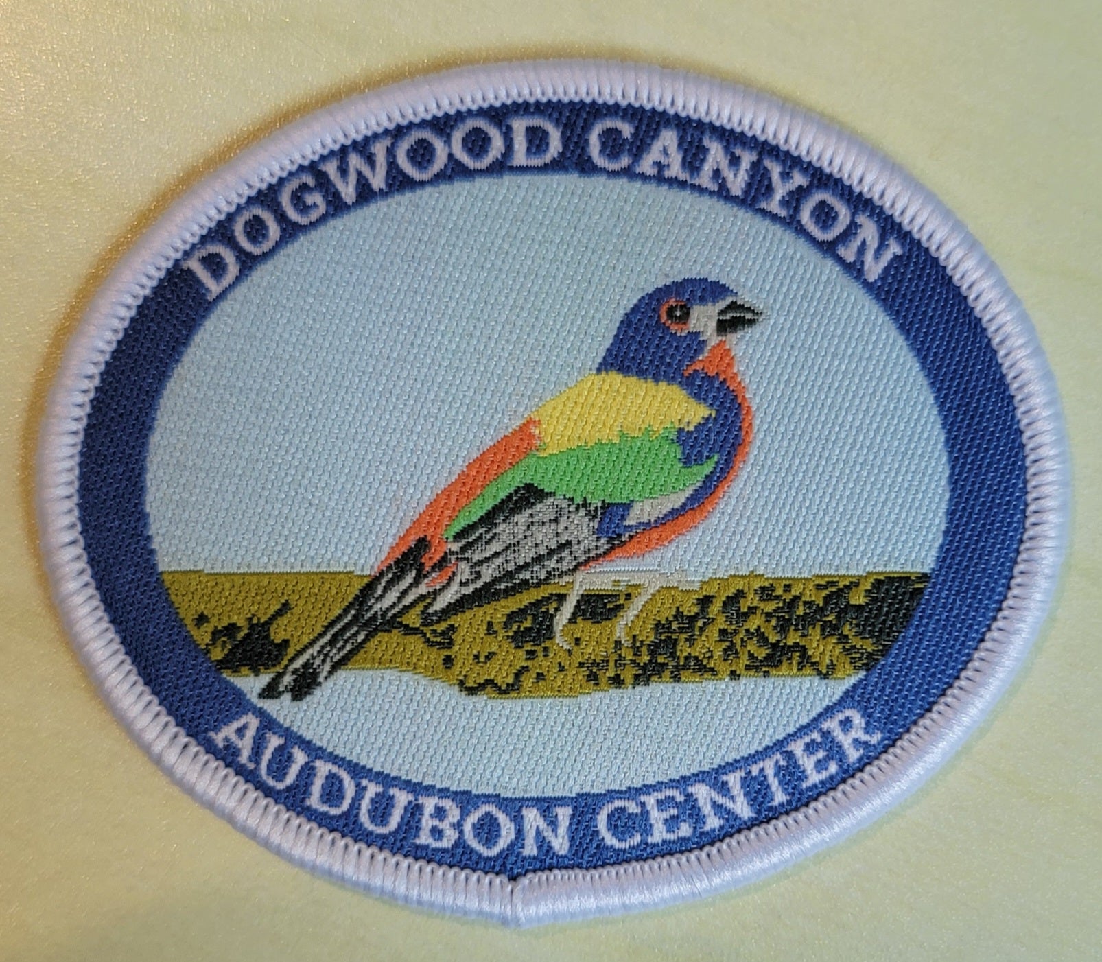 2.5" x 2.0" oval embroidered patch with "Dogwood Canyon Audubon Center" and painted bunting