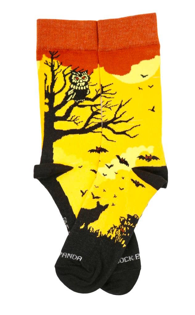 Not just a cool sock for Halloween. This is a really eloquently designed sock with a pensive owl resting in a tree, a calm coyote and free flying bats.