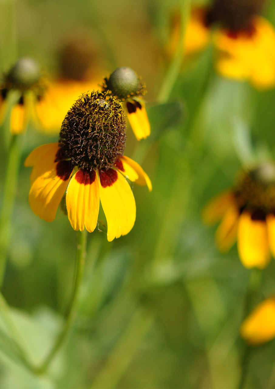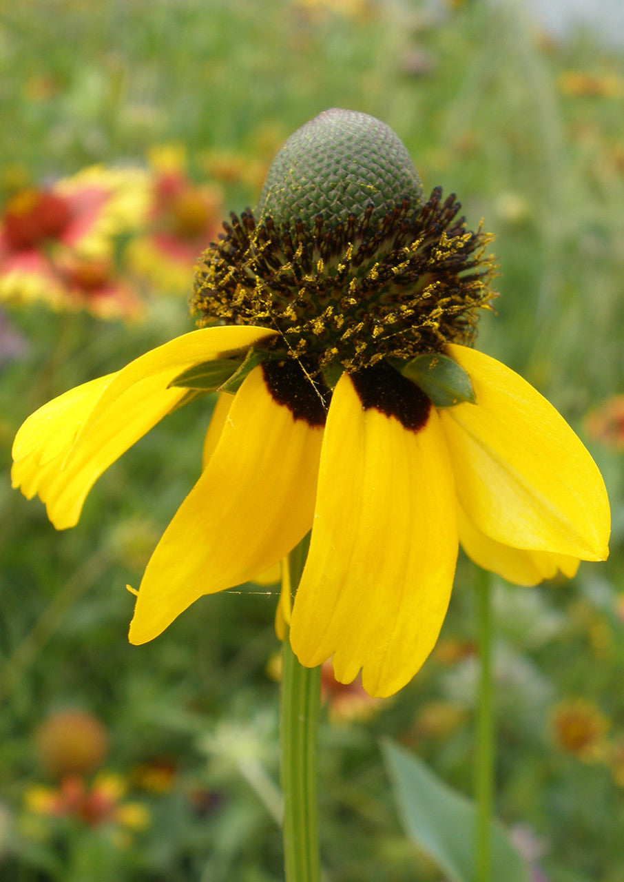 Very easy to grow. Often found along drainages or bottomland farm fields when left fallow after cultivation. Flower petals can be solid yellow or yellow with a little reddish brown near the 'cone' portion. Clasping Coneflower is named for the way the base of the leaves clasp themselves around the stem of the plant. Range is Georgia to Texas.