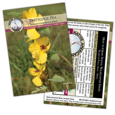 The roots have nitrogen-fixing properties that enhance the soil that they are growing in. Overall, this is one of our best habitat plants. The Partridge Pea is easy in sandy or loamy soils, as long as they are well drained. Though they germinate in late spring, be sure to plant them in the fall. They need to over-winter in the ground.