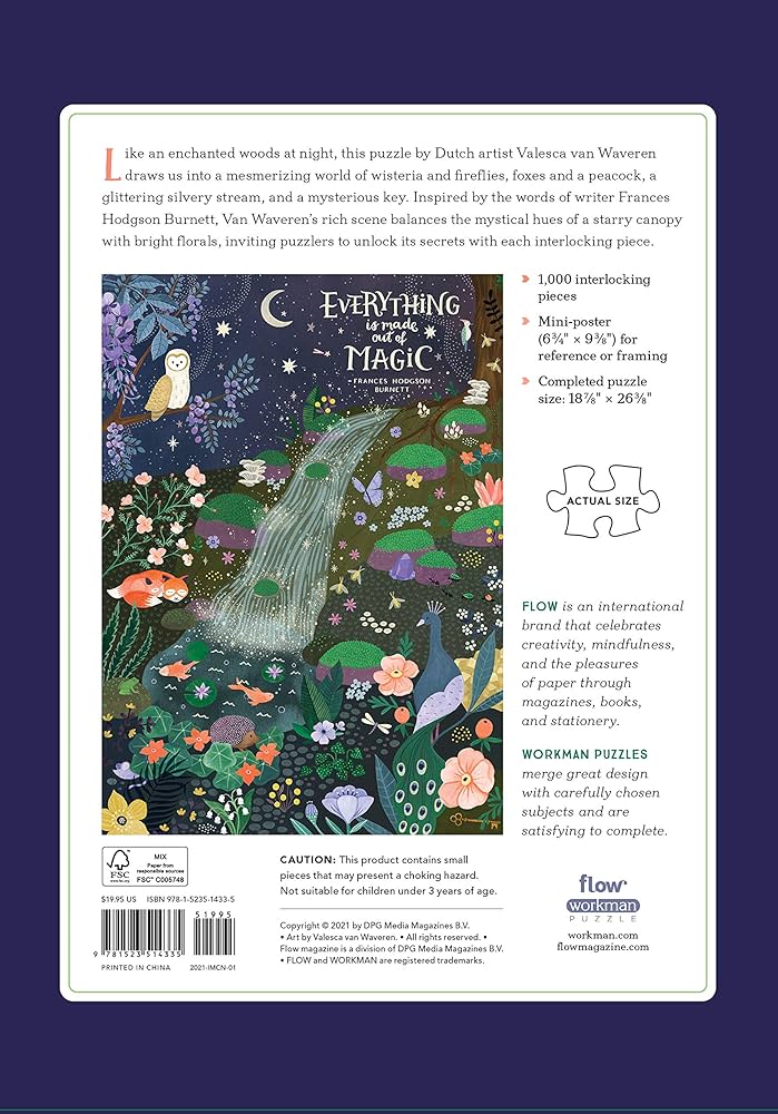 This puzzle by Dutch artist Valesca van Waveren draws us into a mesmerizing world of wisteria and fireflies, foxes and a peacock, a glittery silvery stream, and a mysterious key. Inspired by the words of writer Frances Hodgson Burnett, Van Waveren’s rich scene balances the mystical hues of a starry canopy with bright florals, inviting puzzlers to unlock its secrets with each interlocking piece.