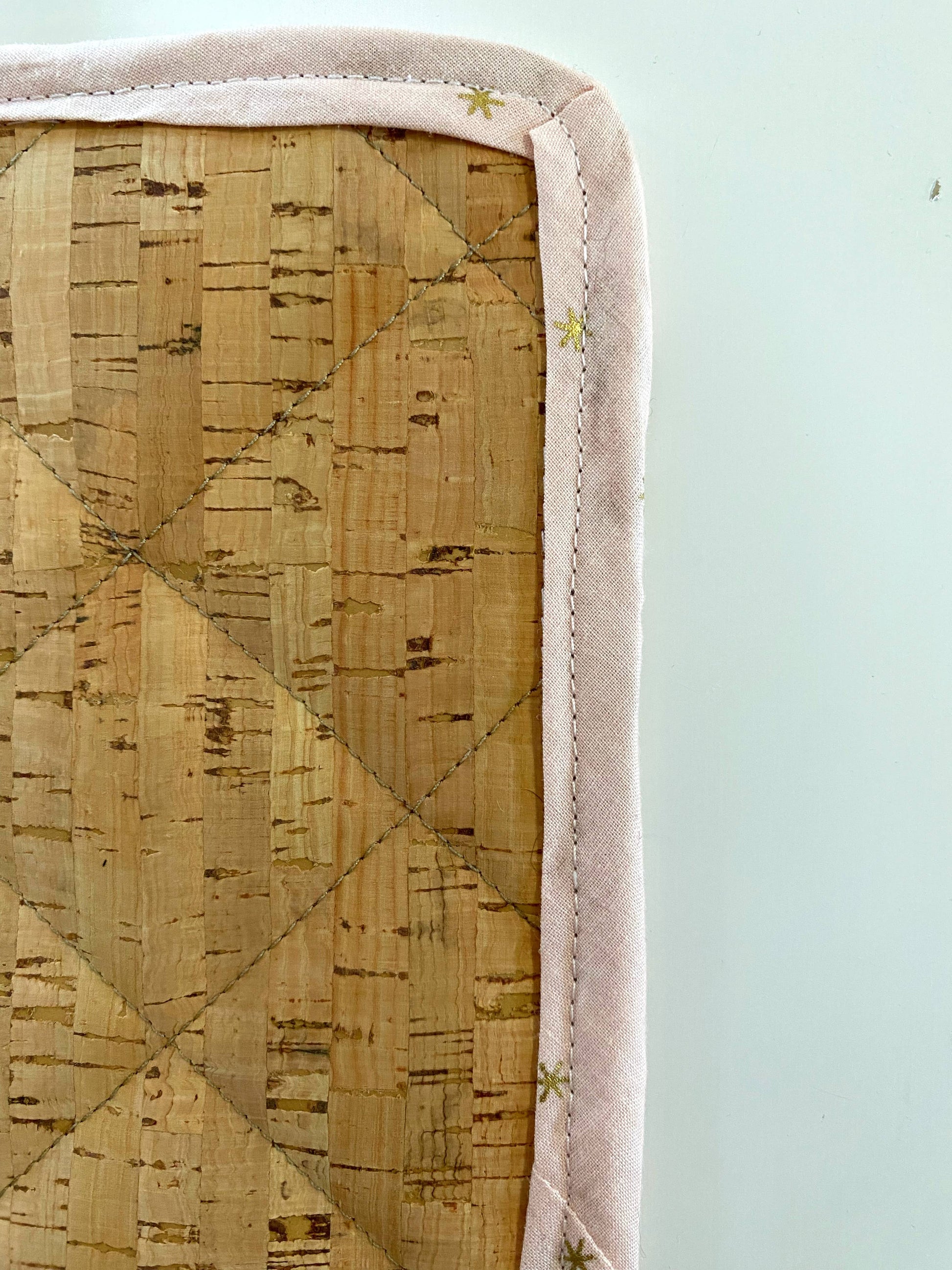 Potholder made from upholstery grade cork fabric and quilting cotton fabric.