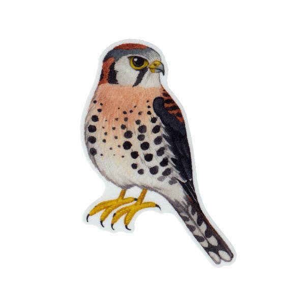 This sticker features an original watercolor painting of an American Kestrel by Florida artist Kate Dolamore. Made of durable vinyl and laminated to protect against scratches, rain, and sun. t measures 3.75" inches and has a matte finish. It can be used on water bottles, laptops, cars, planners, mailboxes, etc.