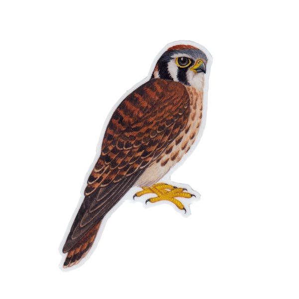 This sticker features an original watercolor painting of an American Kestrel by Florida artist Kate Dolamore. is made of a durable vinyl, laminated to protect against scratches, rain, and sun. It measures 4" inches from head to tail and has a matte finish. It can be used on water bottles, laptops, cars, planners, mailboxes, etc.