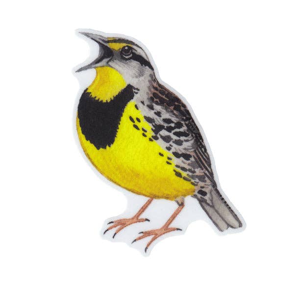 This sticker features an original watercolor painting of an Eastern Meadlowlark by Florida artist Kate Dolamore. Made of durable vinyl and laminated to protect against scratches, rain, and sun. It measures approximately 3.5" tall and has a matte finish. It can be used on water bottles, laptops, cars, planners, mailboxes, etc.