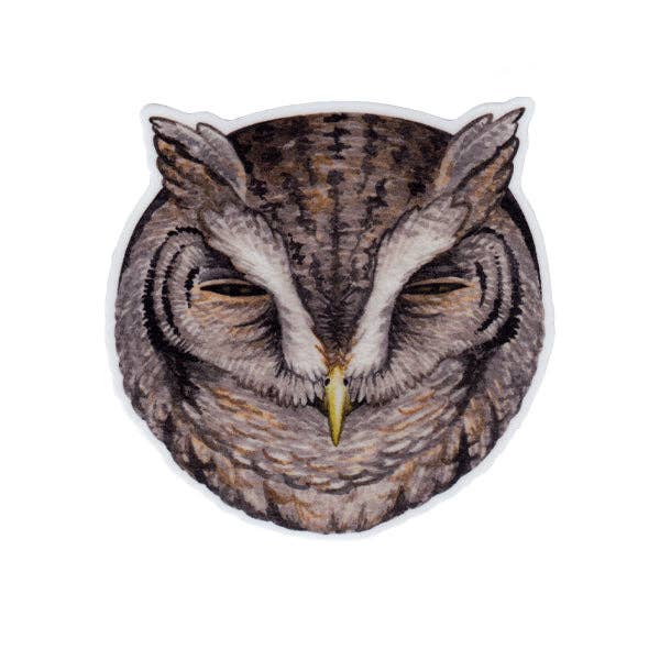 This sticker features an original watercolor painting of an Eastern Screech Owl by Florida artist Kate Dolamore. Made of durable vinyl and laminated to protect against scratches, rain, and sun. It measures approximately 3" across and has a matte finish. It can be used on water bottles, laptops, cars, planners, mailboxes, etc.