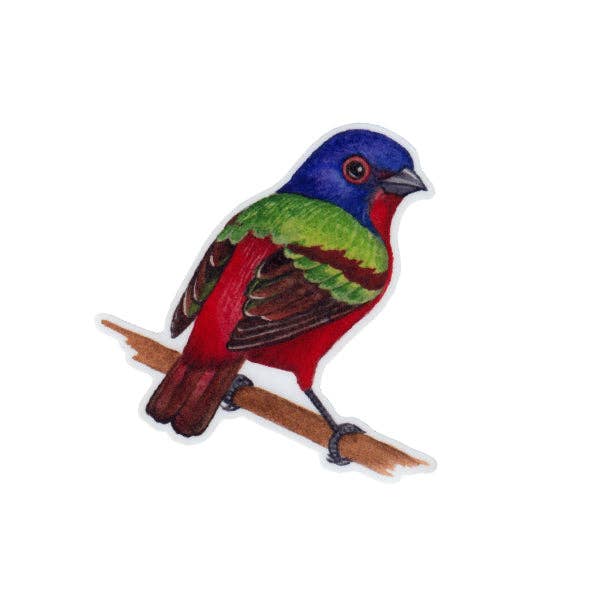 This sticker features an original watercolor painting of a Painted Bunting by Florida artist Kate Dolamore. Made of durable vinyl and laminated to protect against scratches, rain, and sun. It measures approximately 3" x 3" and has a matte finish. It can be used on water bottles, laptops, cars, planners, mailboxes, etc.