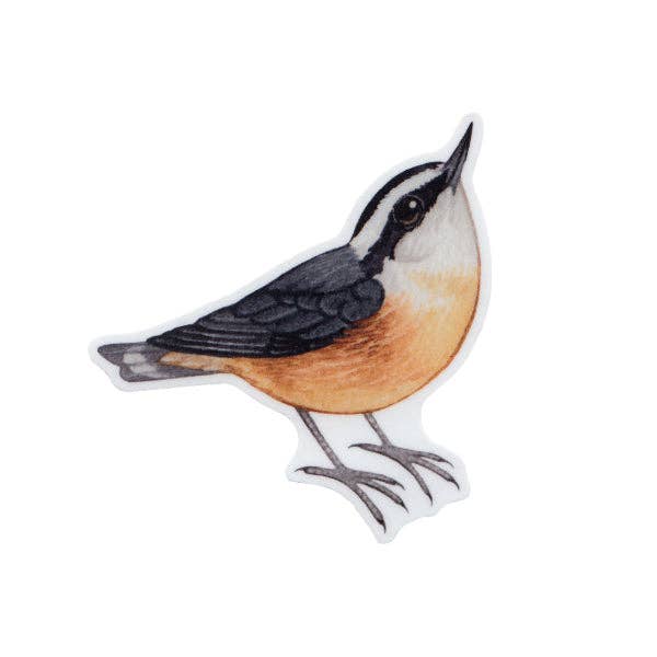 This sticker features an original watercolor painting of a Red-breasted Nuthatch by Florida artist Kate Dolamore. Made of durable vinyl and laminated to protect against scratches, rain, and sun. It measures approximately 3.25" from tail to bill and has a matte finish. It can be used on water bottles, laptops, cars, planners, mailboxes, etc.