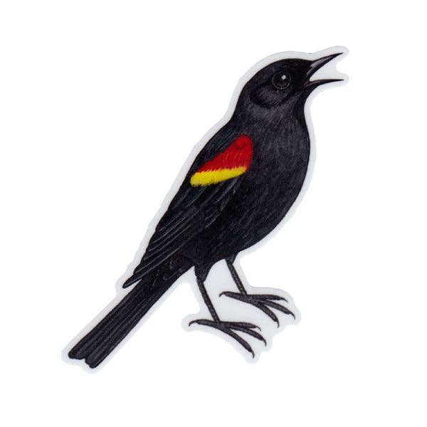 This sticker features an original watercolor painting of a Red-winged Blackbird by Florida artist Kate Dolamore. Made of durable vinyl and laminated to protect against scratches, rain, and sun. It measures approximately 4" from head to tail and has a matte finish. It can be used on water bottles, laptops, cars, planners, mailboxes, etc.