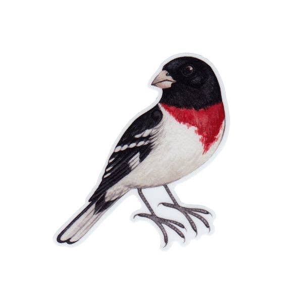 This sticker features an original watercolor painting of a Rose-breasted Grosbeak by Florida artist Kate Dolamore. Made of durable vinyl and laminated to protect against scratches, rain, and sun. It measures approximately 3.75" from head to tail and has a matte finish. It can be used on water bottles, laptops, cars, planners, mailboxes, etc.